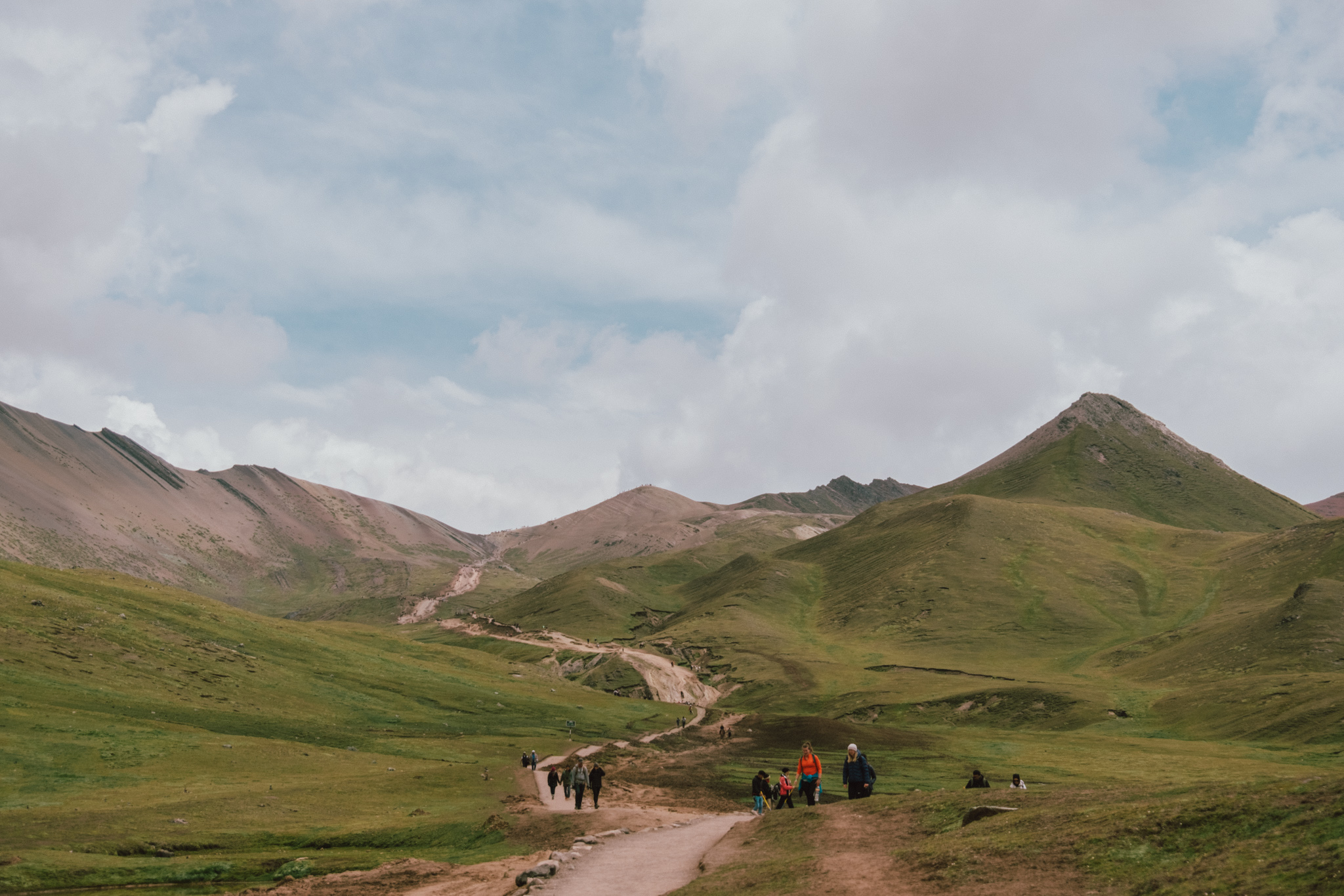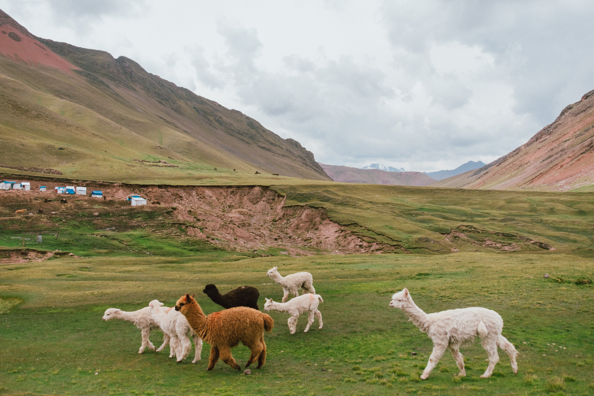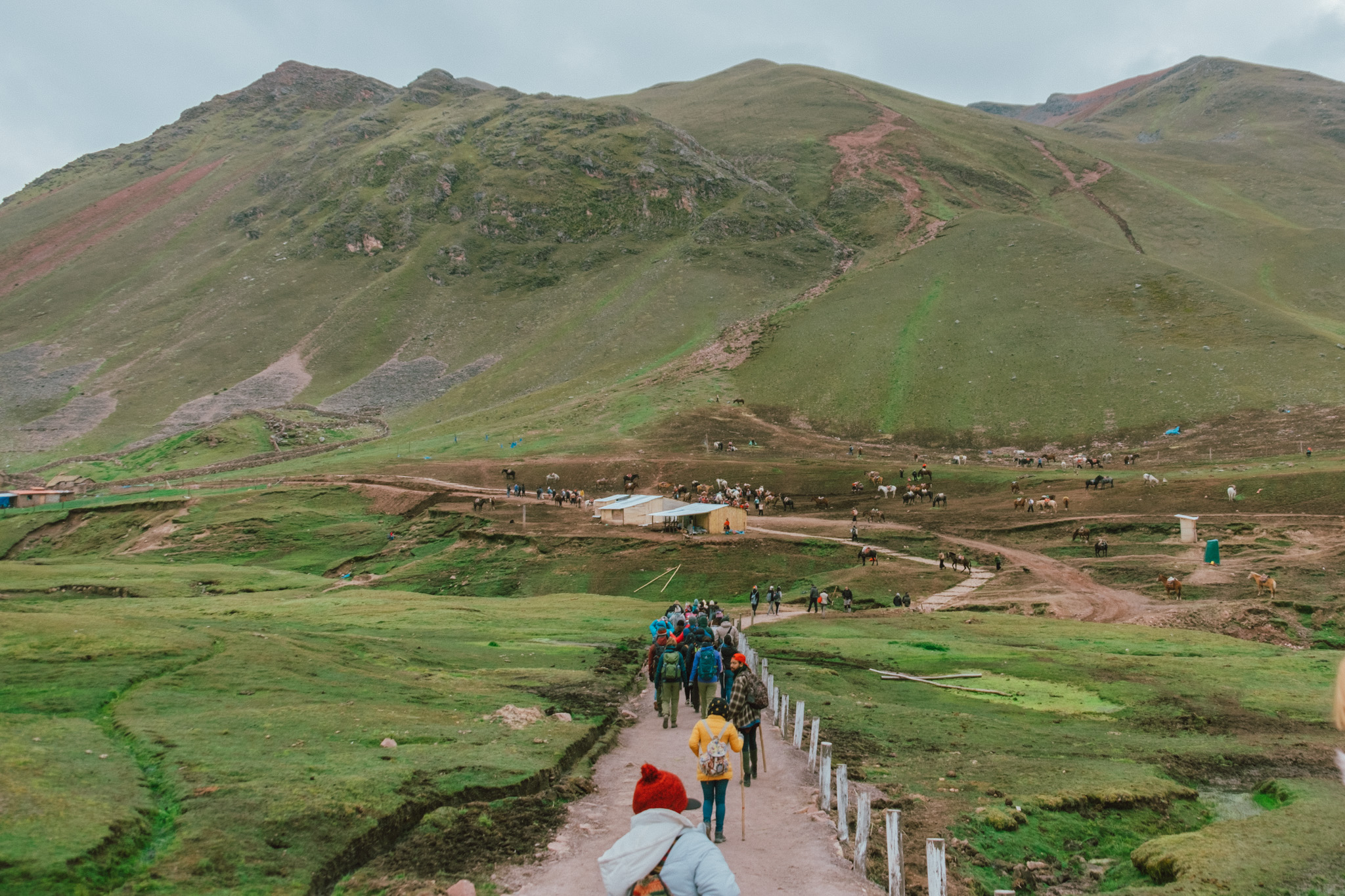 หนึ่งชั่วโมงผ่านไปพร้อมๆ กับทิวทัศน์ที่หลากหลาย รถตู้ก็พาเรามาถึงจุดตั้งต้นของการ Hiking กันแล้วจ้า ซึ่งแค่จุดเริ่มต้นก็มีความตื่นตาตื่นใจกันพอควรละกับหมู่บ้านเล็กๆ บนภูเขาหญ้าสีเขียวไกลลิบ พร้อมฝูงอัลปากาสีขาวขนปุยเดินเล็มหญ้ากันแบบชิวๆ เป็นวิวที่ชวนชื่นใจซะเหลือเกิน และจากจุดเริ่มต้นนี้ก็จะถึงคราที่เราต้องตัดสินใจเลือกกันแล้วว่าจะขึ้นไปชม Rainbow Mountain ด้วยการเดินหรือการขี่ม้าไป ซึ่งถ้าจะขี่ม้าก็จะต้องจ่ายเพิ่มราคาอยู่ที่ม้า 1 ตัวต่อ 1 คน 60 Sol (600 บาท) ถ้าจะขี่กลับด้วยก็ต้องจ่ายราคา 90 Sol