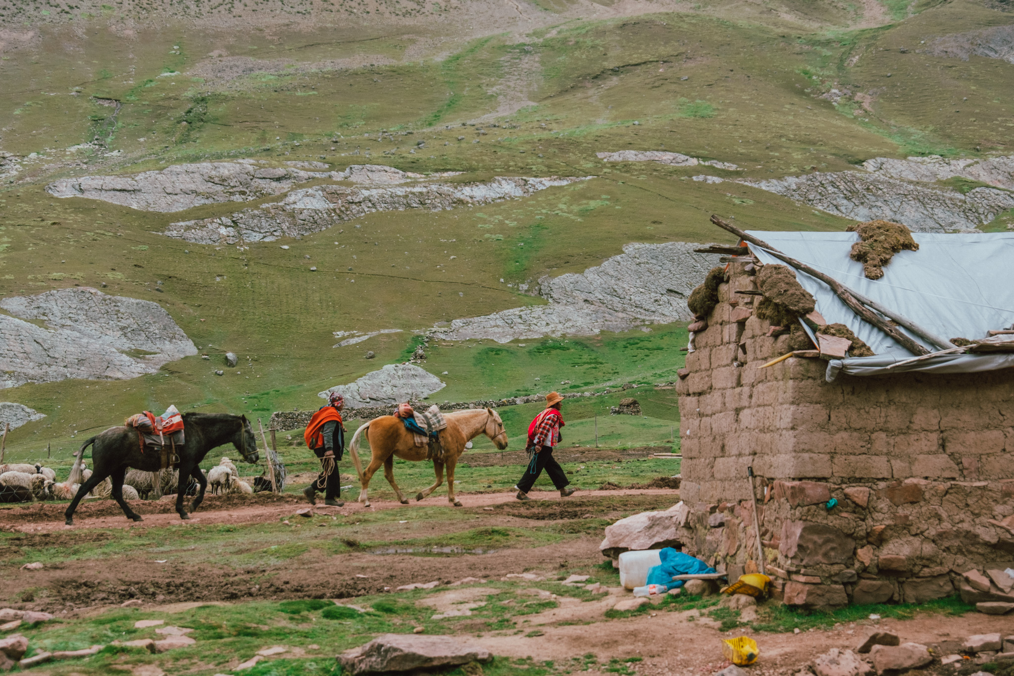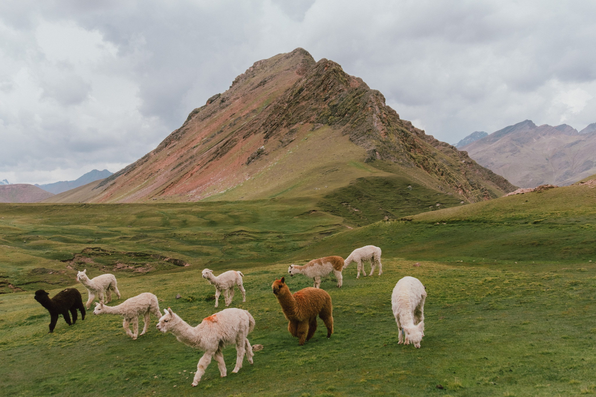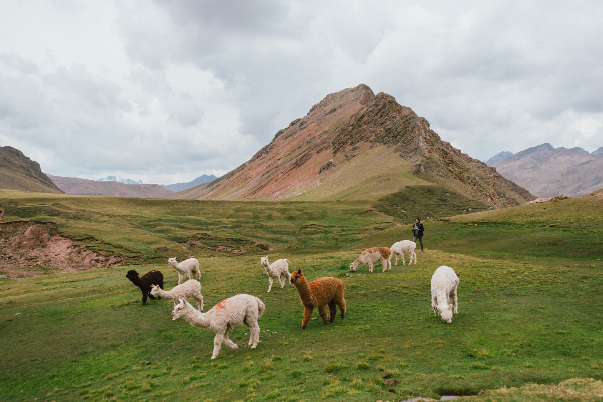 หนึ่งชั่วโมงผ่านไปพร้อมๆ กับทิวทัศน์ที่หลากหลาย รถตู้ก็พาเรามาถึงจุดตั้งต้นของการ Hiking กันแล้วจ้า ซึ่งแค่จุดเริ่มต้นก็มีความตื่นตาตื่นใจกันพอควรละกับหมู่บ้านเล็กๆ บนภูเขาหญ้าสีเขียวไกลลิบ พร้อมฝูงอัลปากาสีขาวขนปุยเดินเล็มหญ้ากันแบบชิวๆ เป็นวิวที่ชวนชื่นใจซะเหลือเกิน และจากจุดเริ่มต้นนี้ก็จะถึงคราที่เราต้องตัดสินใจเลือกกันแล้วว่าจะขึ้นไปชม Rainbow Mountain ด้วยการเดินหรือการขี่ม้าไป ซึ่งถ้าจะขี่ม้าก็จะต้องจ่ายเพิ่มราคาอยู่ที่ม้า 1 ตัวต่อ 1 คน 60 Sol (600 บาท) ถ้าจะขี่กลับด้วยก็ต้องจ่ายราคา 90 Sol