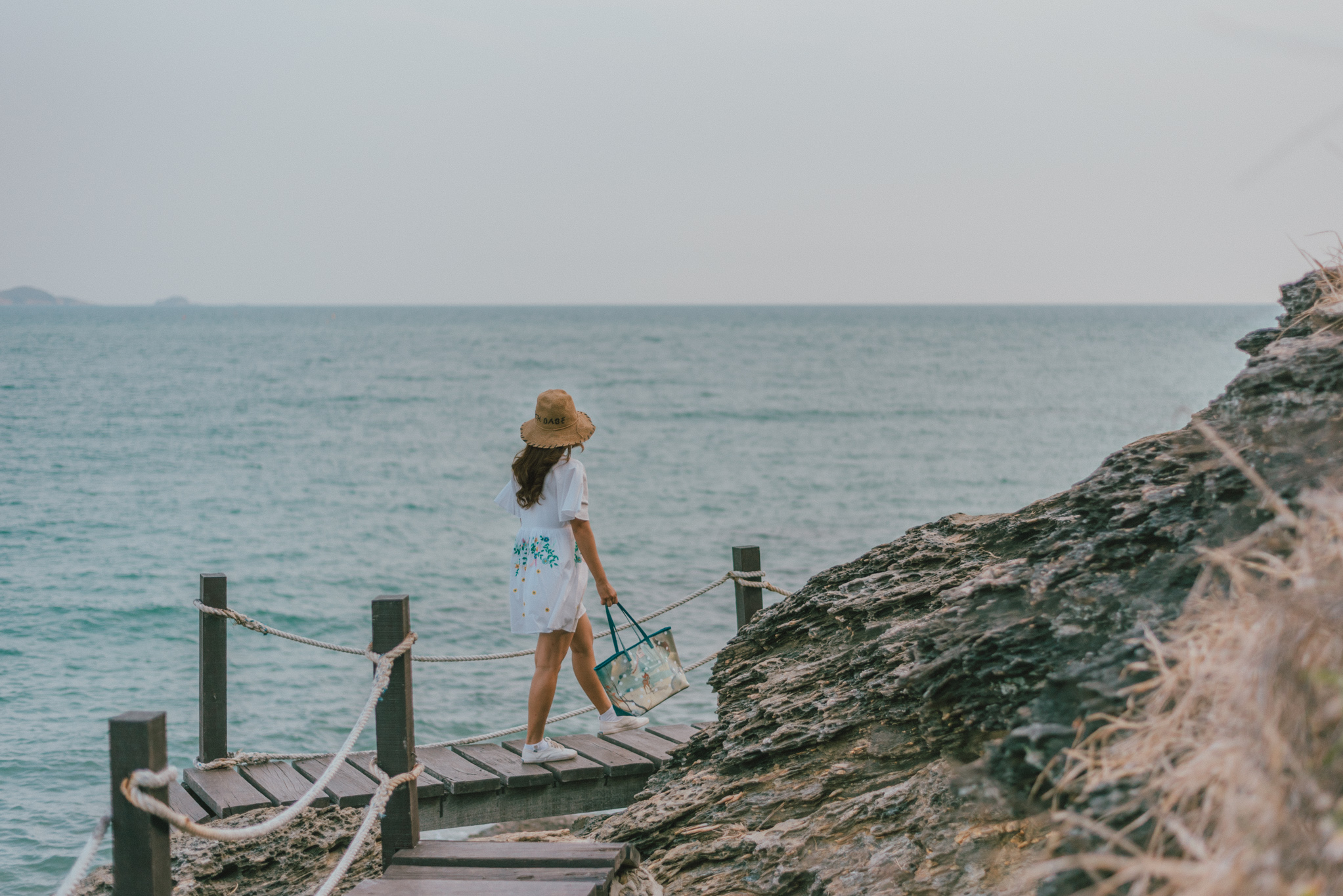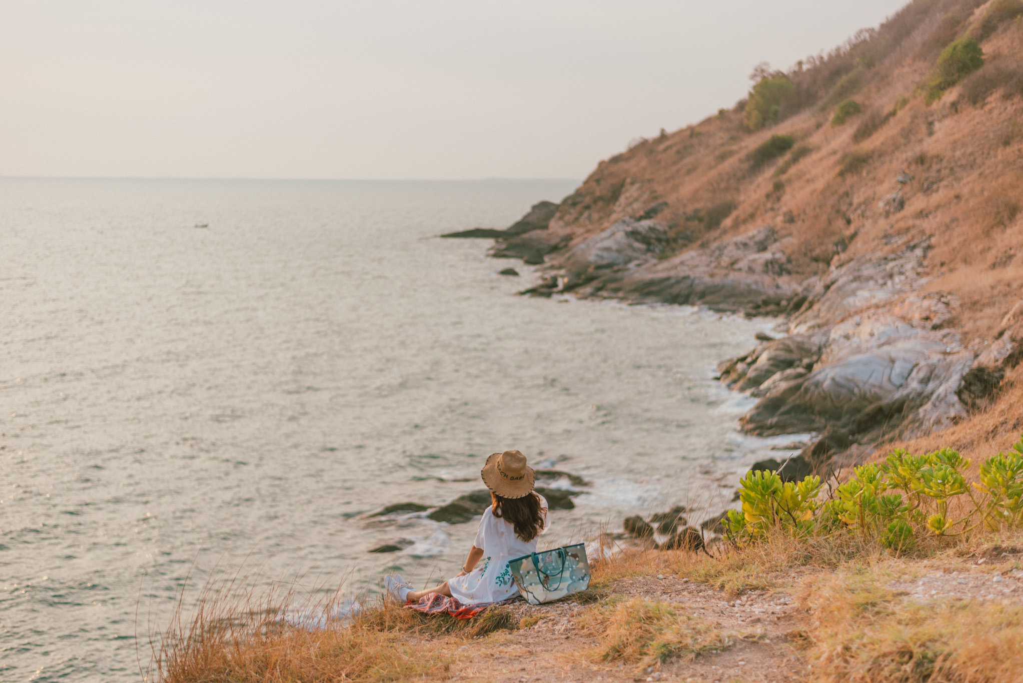 ตกหลุมรักร้านปาฎีแบบปาใจให้รัวๆ ไปแล้ว ยามเย็นแดดเริ่มร่มลมเริ่มพัดเรามาเช็คอินกันต่อที่ เขาแหลมหญ้า สถานที่ท่องเที่ยวยอดนิยมที่มีบ้านสีขาวและมีแบ๊กกราวด์เป็นวิวทะเล มองเห็นเกาะเสม็ดอยู่ไกลๆ ที่นี่เป็นภูเขาเตี้ยๆ ที่ถูกปกคลุมด้วยป่าละเมาะ บางเดือนก็จะมีทุ่งหญ้าสีทองขึ้นมาให้ถ่ายรูปเล่น เราเชื่อว่าหลายคนคงเคยมาเที่ยวที่นี่กันบ้างแล้ว แต่น่าจะมีบางคนที่ยังไม่เคยเดินทางไปสัมผัสธรรมชาติและความงามของแสงสุดท้ายที่หน้าผาหิน ดังนั้นวันนี้เราจะพาทุกคนเดินไปนั่งปล่อยใจให้เซกับทะเลแล้วเอนตัวดูพระอาทิตย์ตกดินไปพร้อมกัน ไปจ้าาาา!!!