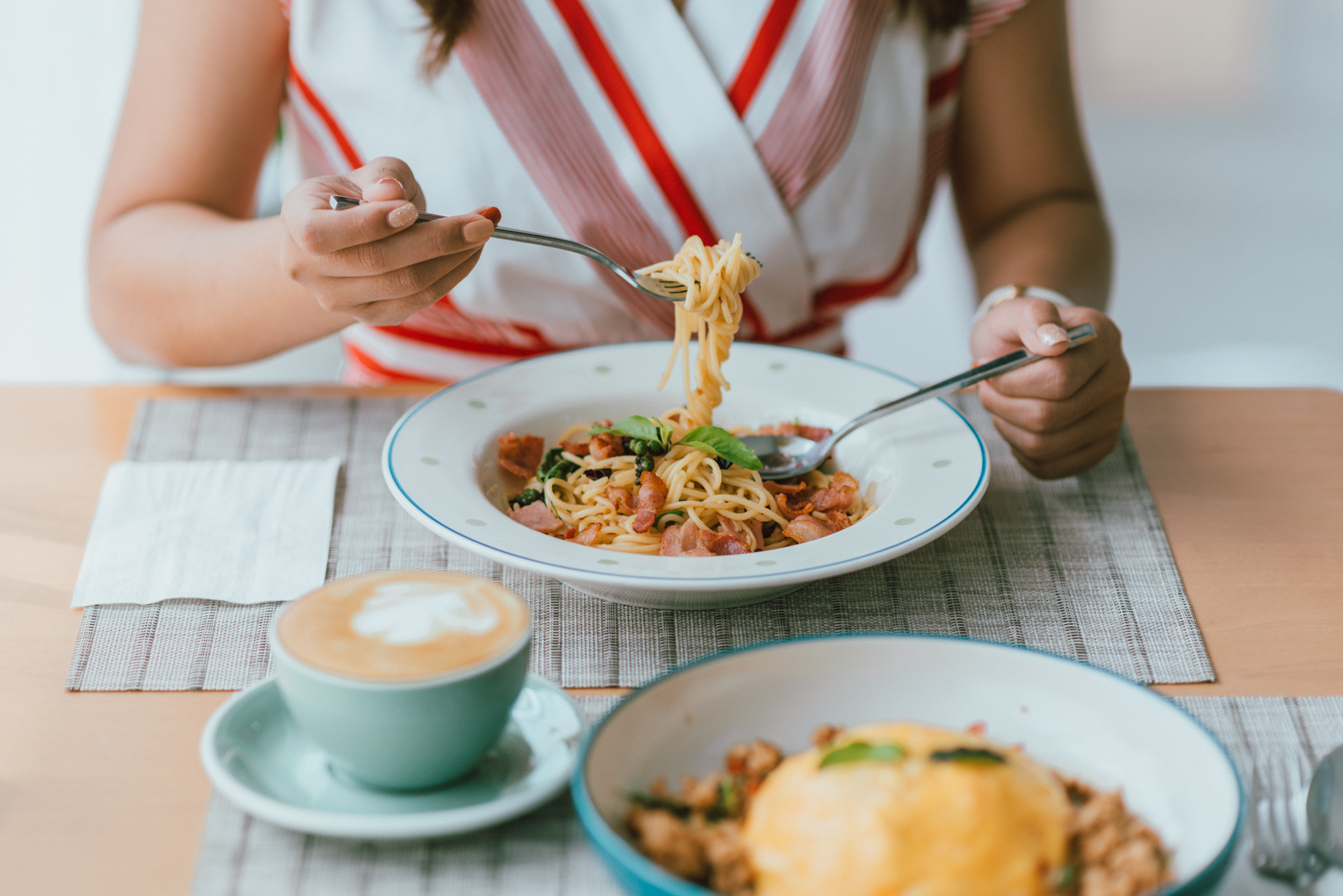 นอกจากร้านคุมโทนดีงามแล้ว ในส่วนของเมนูก็เลิศไม่แพ้กันจ้า มีทั้งอาหารคาวหวาน เครื่องดื่ม กาแฟ เบเกอรี่ไว้ให้เลือกทานหลากหลายมาก เมนูเด่นๆ ก็จะมี Coconut Espresso ที่เป็นการรวมกันระหว่างกาแฟ Espresso เข้มข้นใช้เมล็ดจากปางขอน จังหวัดเชียงราย มีความหอมละมุนพอดี ผสานด้วยความหวานของมะพร้าวน้ำหอมพร้อมเนื้อมะพร้าวนุ่มๆ กรุบๆ เป็นแก้วที่ให้ทั้งพลังงานและความสดชื่นไปพร้อมๆ กันเลยละแก ถ้าใครไม่ถนัดสายกาแฟก็มีเครื่องดื่มอื่นๆ ให้เลือกอีกเยอะมาก ทุกเมนูที่เราลองคือการันตีเลยว่าดีจริงๆ แถมราคาก็ยังสบายกระเป๋า จะสั่งหลายแก้วมาถ่ายรูปก็ไม่รู้สึกผิด