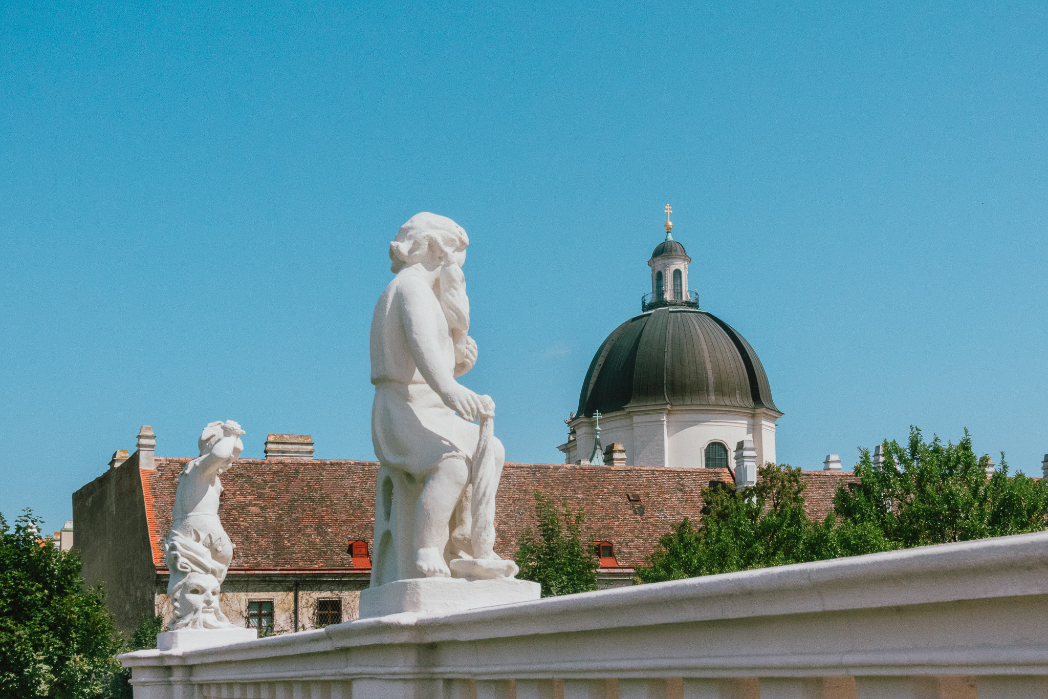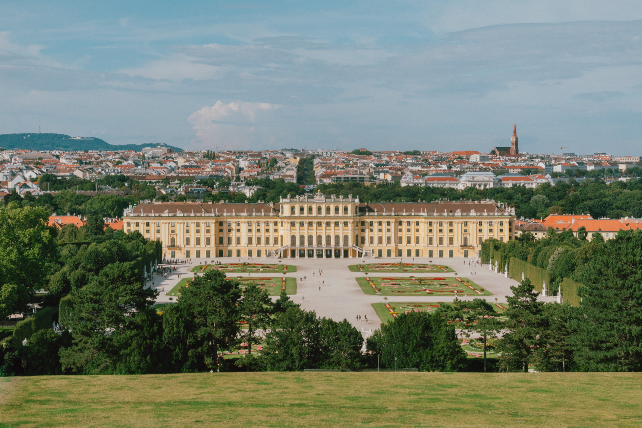 นอกจากจะว้าวกับความสวยงามด้านในแล้ว จุดชมวิวของที่มีก็สวยงามสมกับที่เป็นอดีตที่พำนักของราชวงศ์มาก่อนมาก ๆ ความรู้สึกแรกหลังจากก้าวเท้าออกมาปะทะลมเบา ๆ ที่ตีหน้า คือความสวยงามไม่ต่างจากจุดชมวิวที่มิวเซียมที่มองเห็นได้ทั้งเมือง แต่เพิ่มเติมคือความรู้สึกที่แกรนด์กว่า สูงกว่า ว้าวกว่า จนสามารถเรียกได้ว่านี่คือจุดชมวิวระดับราชาก็ว่าได้ การนั่งชมวิวในครั้งนี้จึงเต็มไปด้วยคำพูดที่อยู่ในลำคอที่วนเวียนอยู่แค่ว่าสวยอ่ะ สวยจัง สวยมาก ๆ อยากเอากลับบ้าน คนส่วนใหญ่จึงนิยมขึ้นมาชมแสงสุดท้ายของเมืองกันที่นี่อย่างคึกคัก และเราก็คือหนึ่งในคนส่วนใหญ่ที่อยากจะขอใช้เวลาช่วงท้ายวันที่เมืองนี้ ณ ในจุดที่ดีที่สุดก่อนกลับเวียนนา