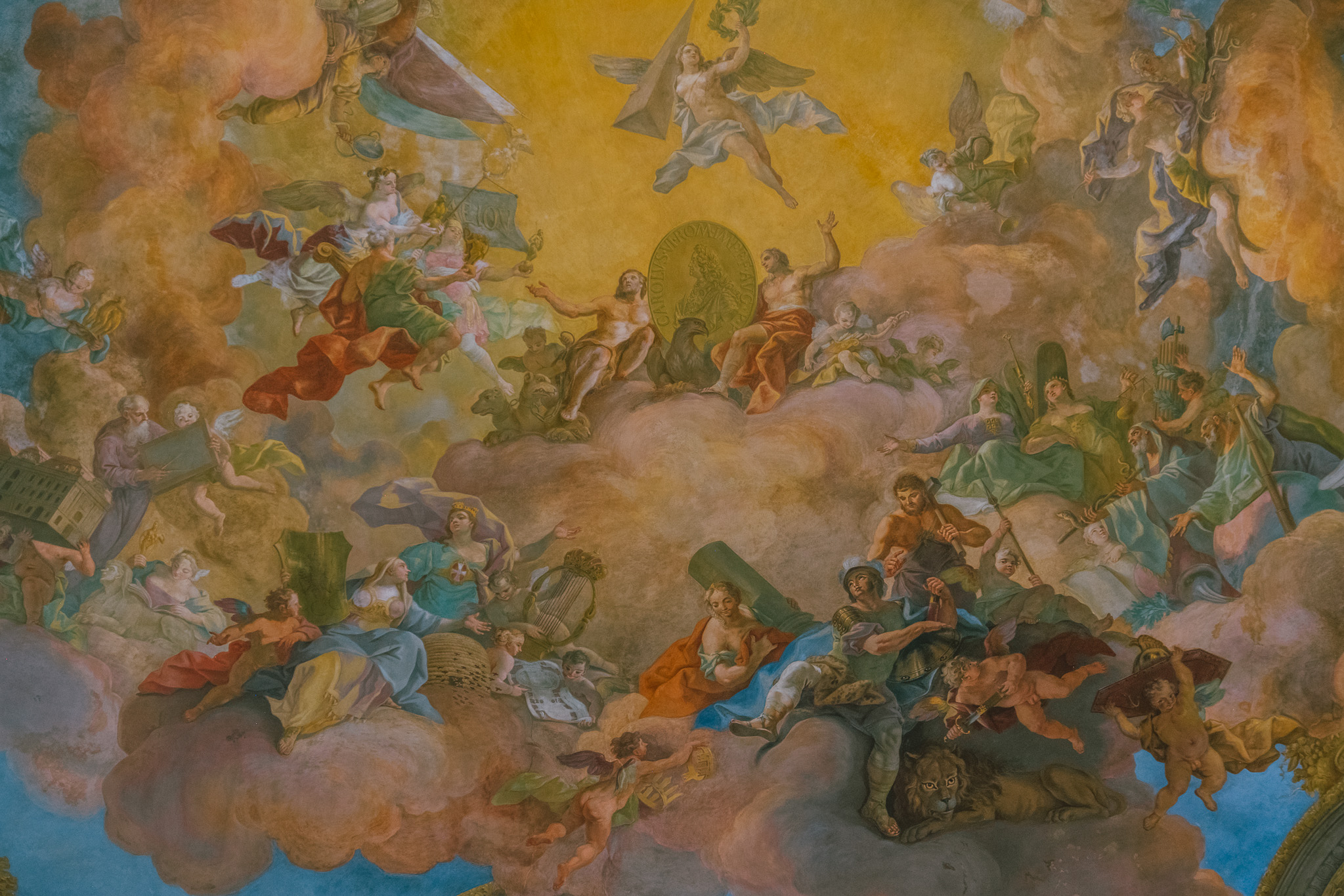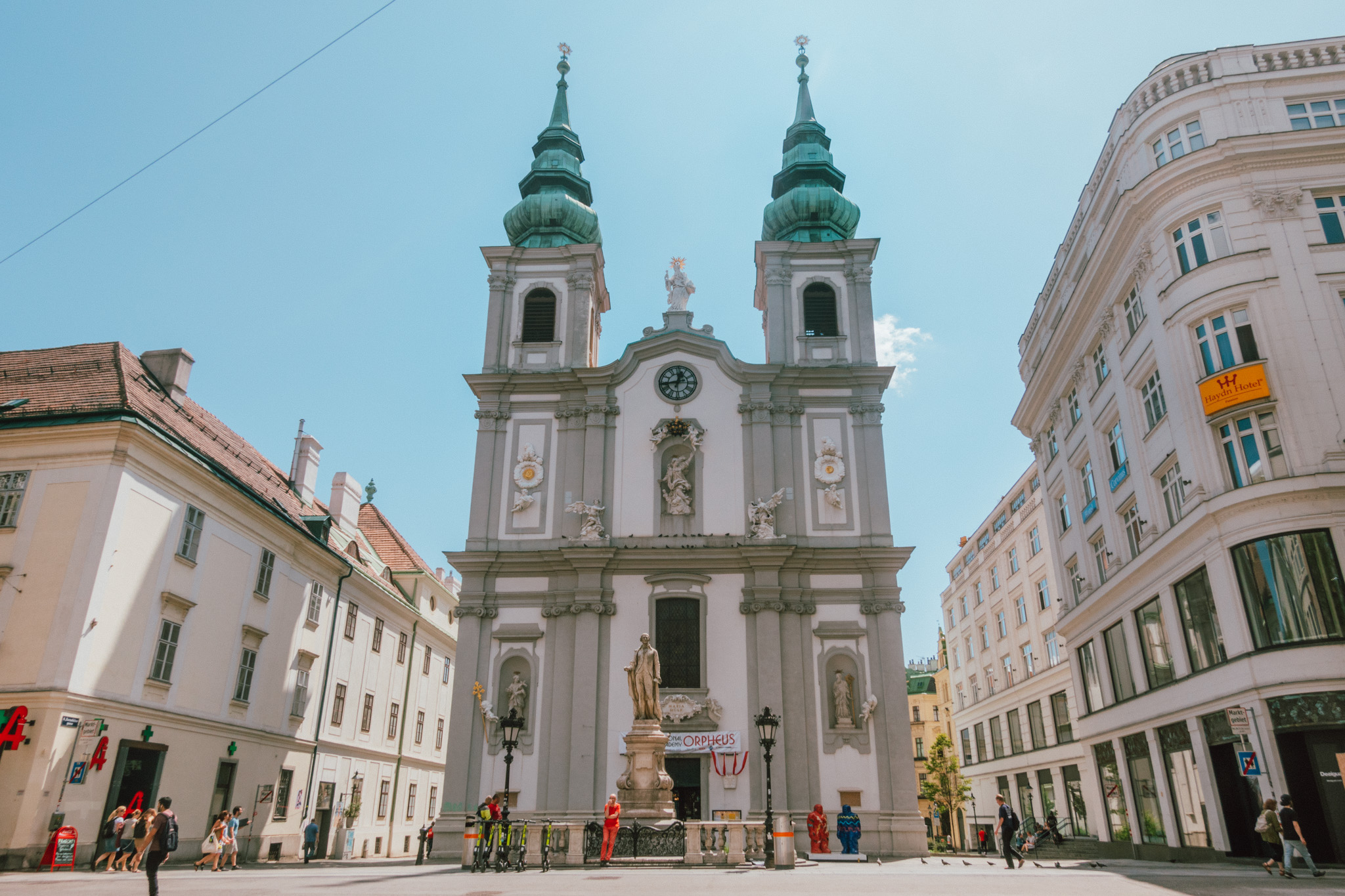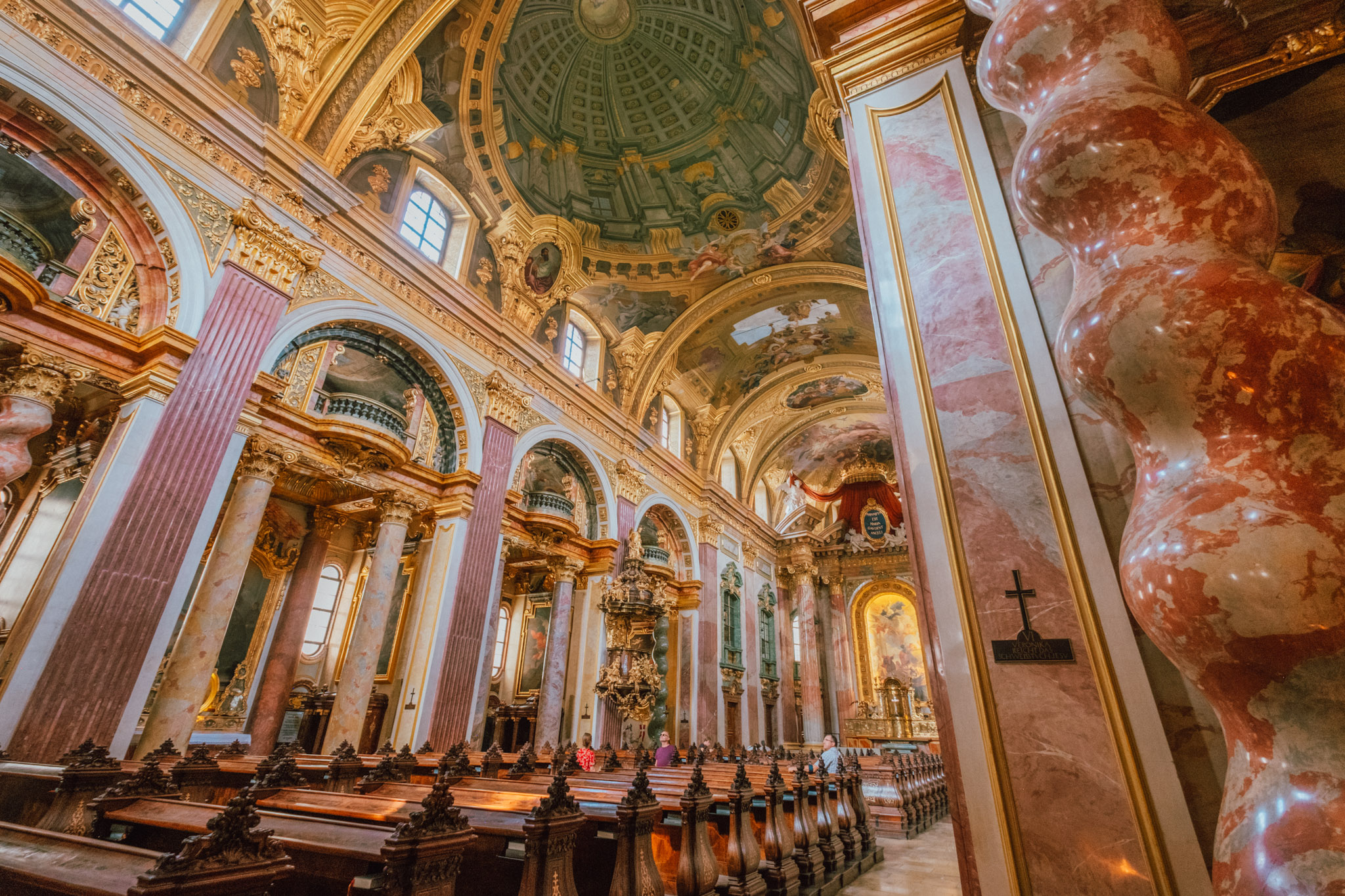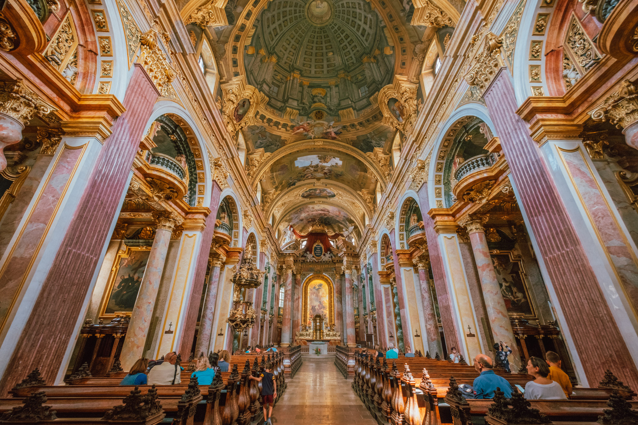 เสพความขมของกาแฟเต็มอิ่ม เราก็ไปชมความสวยงามใหญ่โตของ Jesuit Church ซึ่งโบสถ์สองชั้นสีครีมที่มียอดโดมเป็นสีเขียวเข้มสไตล์บาโรก อายุกว่า 394 ปี ที่รู้จักกันในนามโรงเรียนสอนศาสนา ที่นี่แสดงให้เห็นถึงความร่ำรวยทางวัฒนธรรมของออสเตรียอย่างชัดเจน และผลงานที่เรียกว่าเป็นมาสเตอร์พีซภายในโบสถ์ก็คือเพดานทรงครึ่งวงกลมที่วาดโดยใช้วิธีแบบเฟสโก้ หรือการเขียนสีลงบนปูนโดยตรง เพื่อให้ภาพมีสีสวยสดเป็นเวลานาน กลับเสาทรงโรมันที่ทำมาจากหินอ่อนประดับตกแต่งยอดด้วยหัวเสาแกะสลักสีทอง หรือถ้าจะให้พูดง่าย ๆ ก็คือสวยตั้งแต่พื้นจรดเพดาน ทำให้การเดินเล่นในโบสถ์ของเราไม่เป็นเรื่องน่าเบื่อเลย