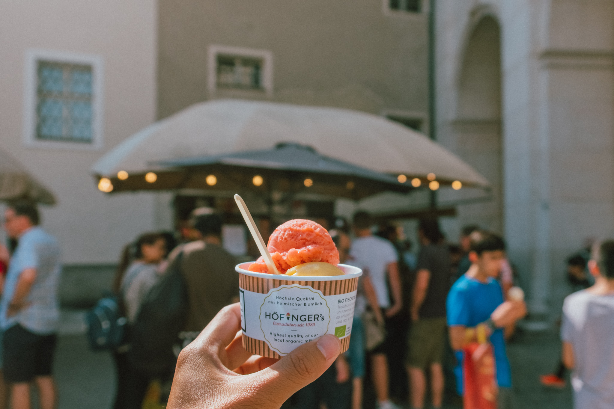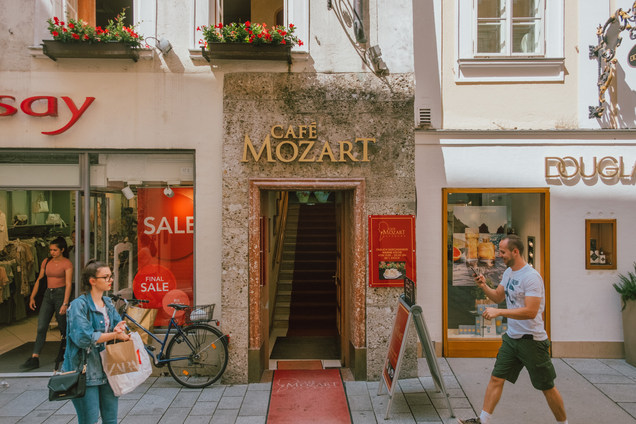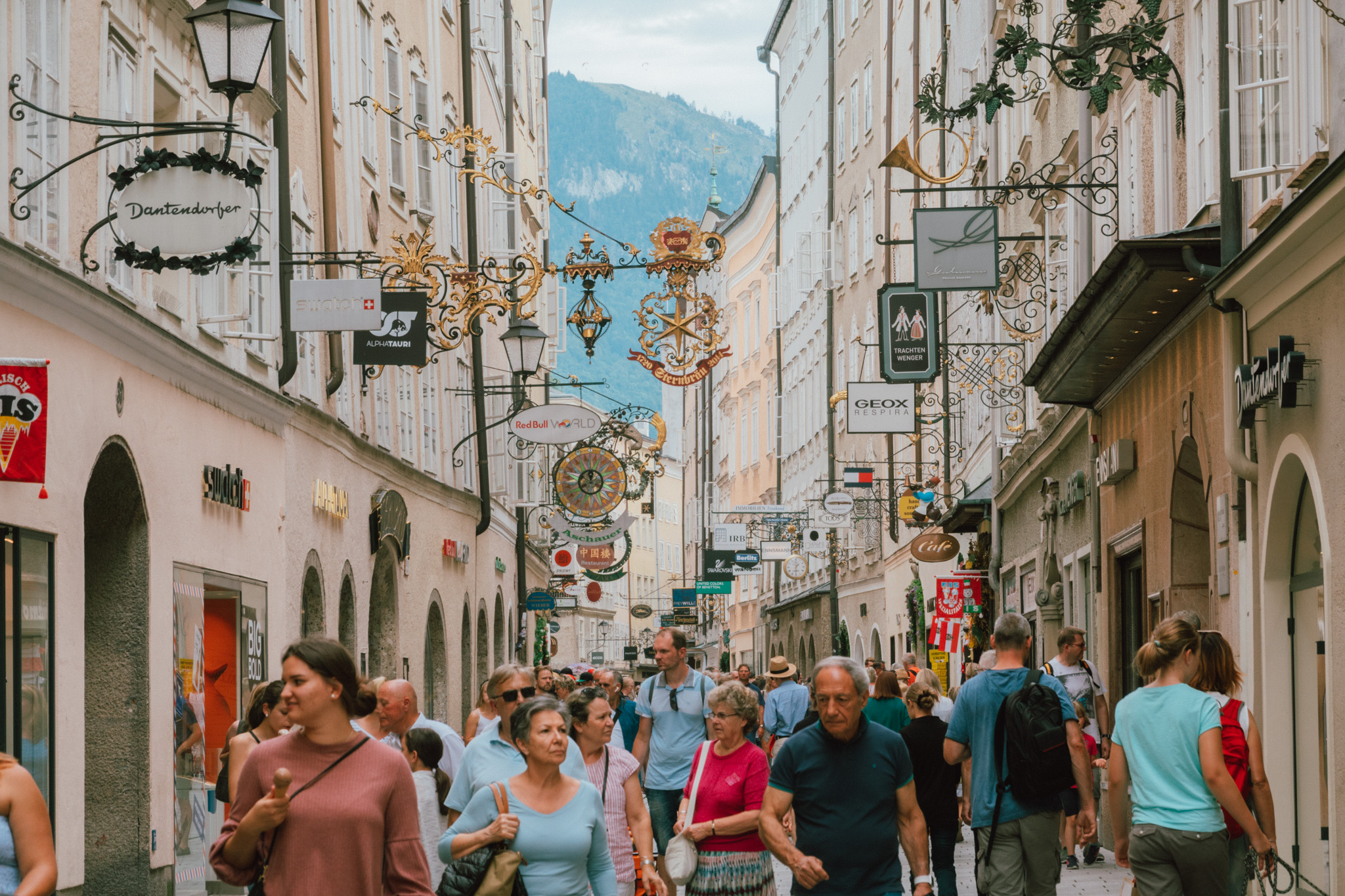 แค่ข้ามฝั่งมาความคึกคักก็ต่างออกไป ทั้งร้านอาหาร คาเฟ่ และร้านช้อปปิ้ง ทั้งแบรนด์เนมไฮแอนด์ สตรีทแบรนด์ และแบรนด์โลคอล ก็มีอยู่เต็มสองทางเดินบนถนน Getreidegasse คราวนี้ขาช้อปถึงคราวต้องแลกเงินผ่าน PLANET SCB ไว้ให้ดี เพราะมานี่ต่อให้ไม่ใช่หมอดูก็ยังรู้ว่ามีเกณฑ์เสียทรัพย์ ฟันธง!!!! อีกเหตุผลของความคึกคัก ก็เพราะย่านนี้เป็นบ้านเกิดของโมสาร์ท ที่ตัวบ้านสีเหลืองมัสตาร์ดตอนนี้ได้กลายเป็นมิวเซียมที่มีชื่อว่า Mozart’s Birthplace Mozart แต่เพราะที่นี่ห้ามถ่ายรูปด้านใน ดังนั้นแกก็คงต้องตีตั๋วมาดูเองด้วยตัวเองแล้วล่ะ