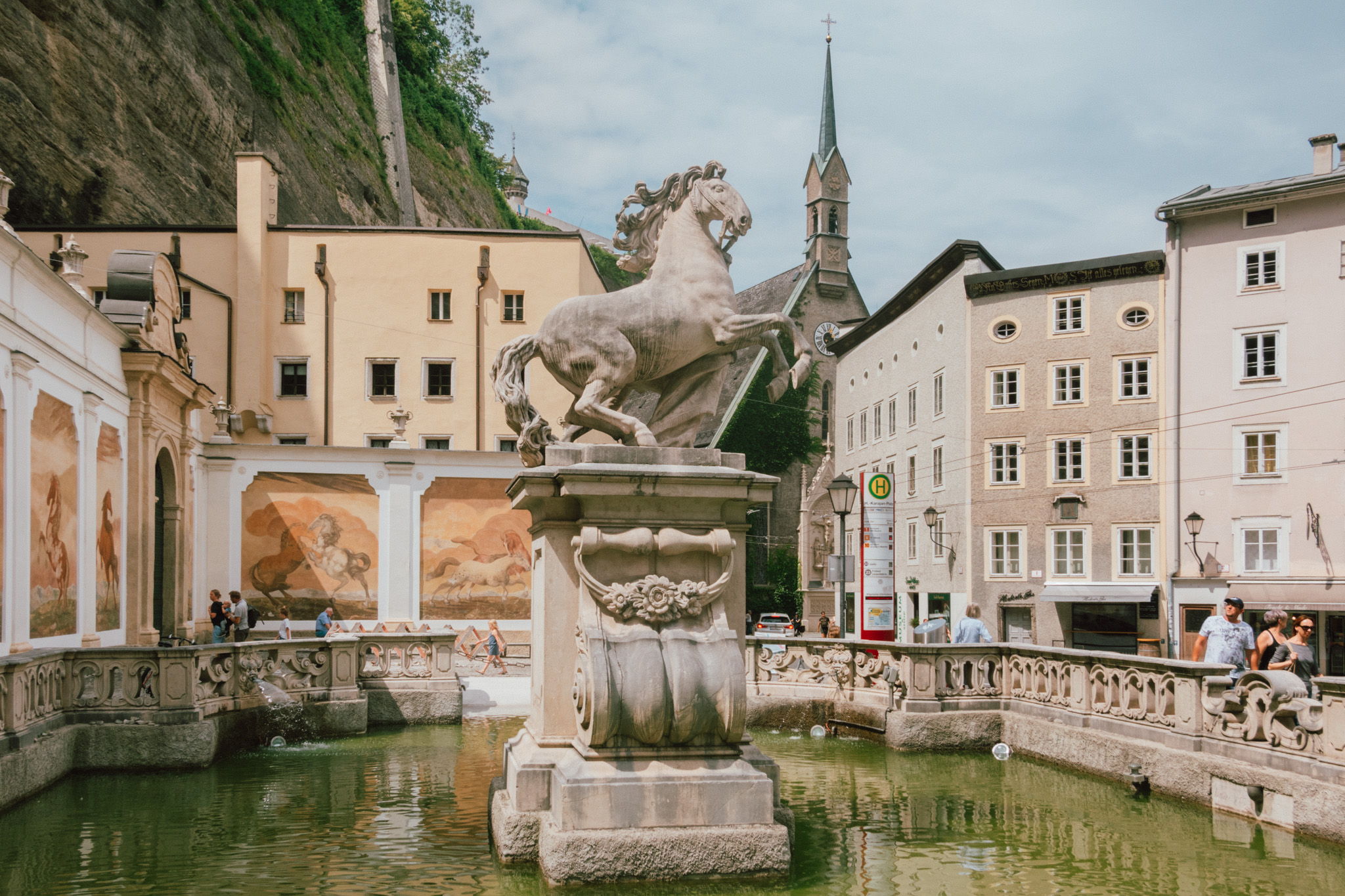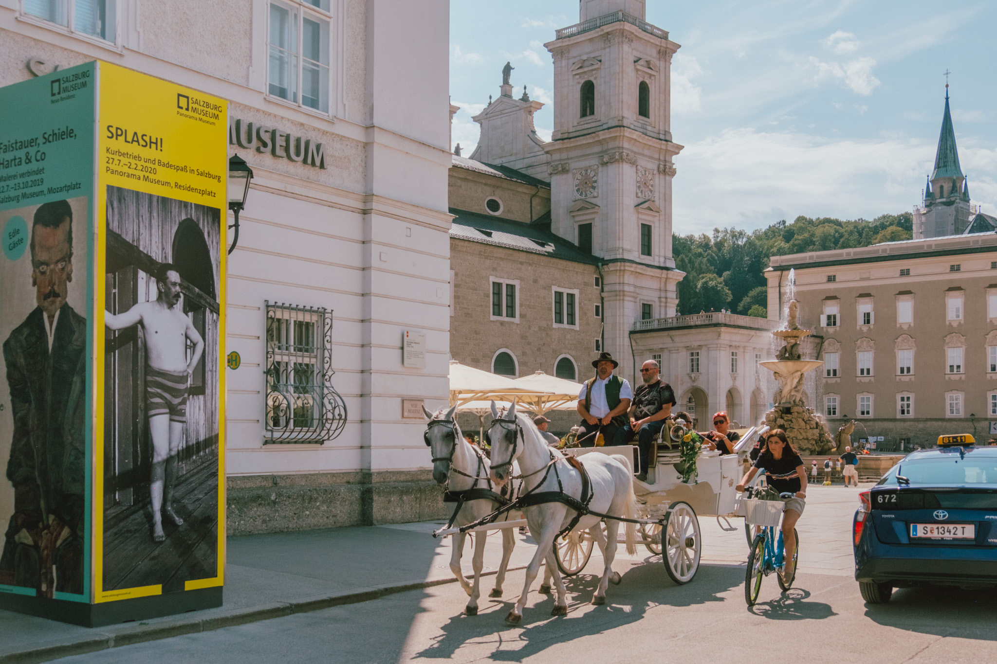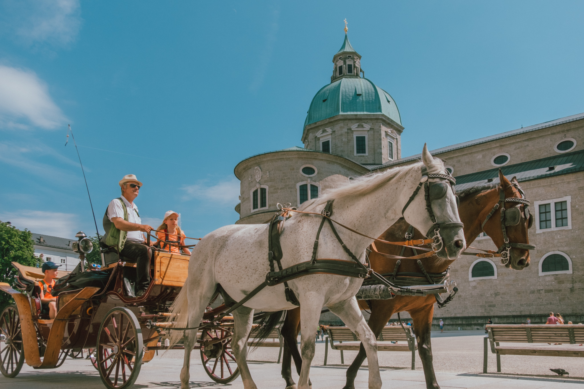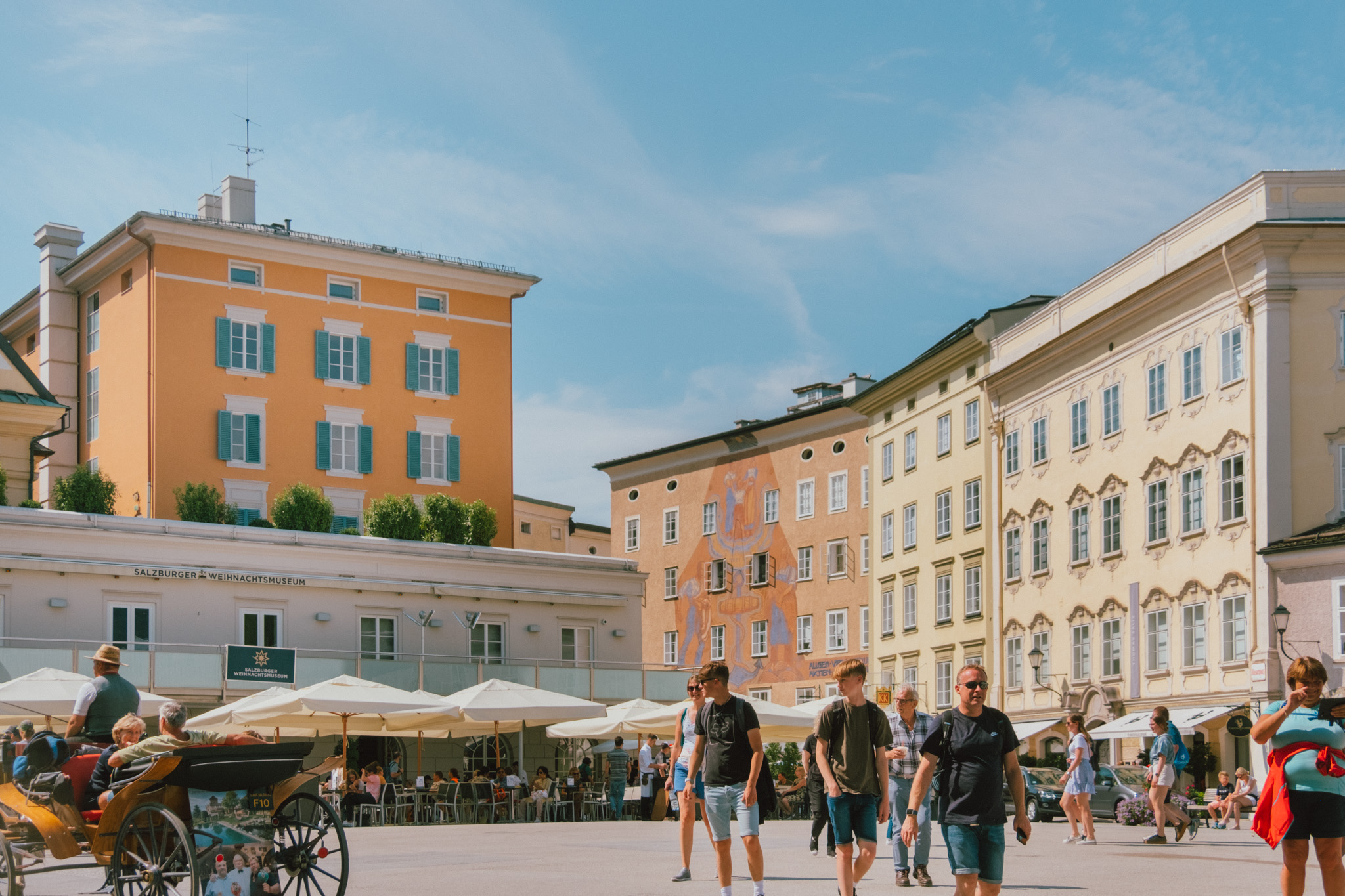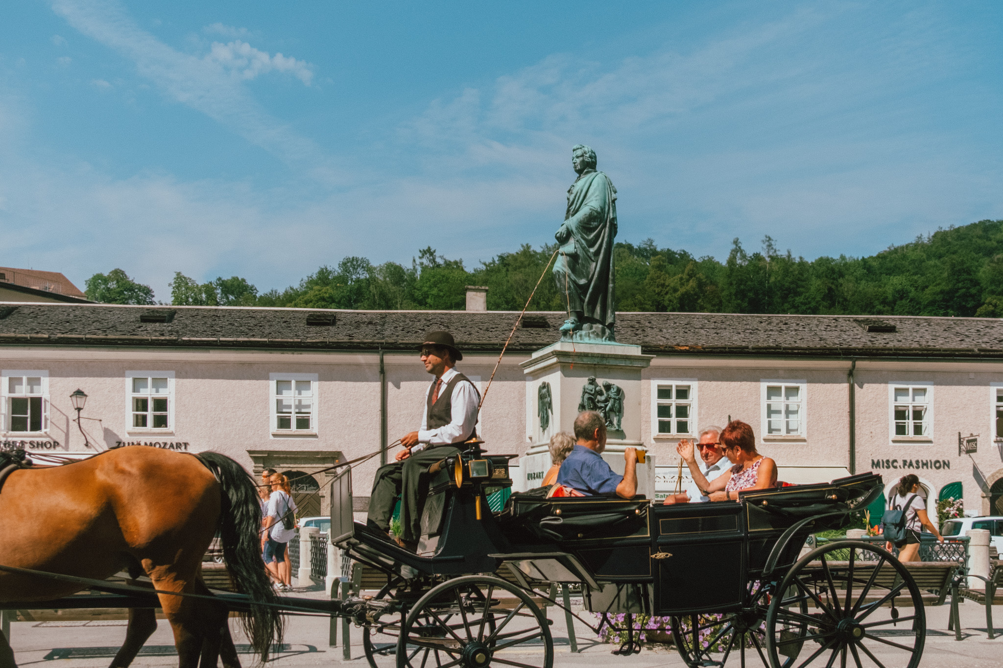 ดูนั่นดูนี่เพลิน ๆ แป๊บเดียว เราก็เดินมาจนเกือบสุดถนน Getredegasse ที่ตั้งของ Mozartplatz & Mozart Monument หรือจตุรัสโมสาร์ท จตุรัสที่สร้างขึ้นเพื่อระลึกถึงนักประพันธ์แห่งศตวรรษ ซึ่งเอาเข้าจริงต่อให้ไม่มีรูปปั้นนี้อยู่ก็คงไม่มีใครลืมเลือนบทเพลงของเค้าได้อย่างแน่นอน ณ บริเวณนี้ค่อนข้างจะคึกคักน้อยลงจากโซนช้อปปิ้ง แต่ที่นี่ก็มีอะไรให้เราเดินดู เดินชม เดินถ่ายรูปได้ไม่รู้เบื่อ ไม่รู้เวลาอยู่ตลอดเส้นทางจริง ๆ ออ แล้วใครอยากนั่งรถม้าชมเมืองจุดนี้ก็มีบริการด้วยเด้อ