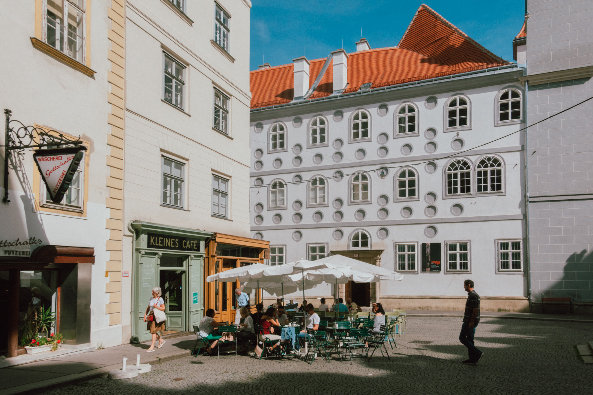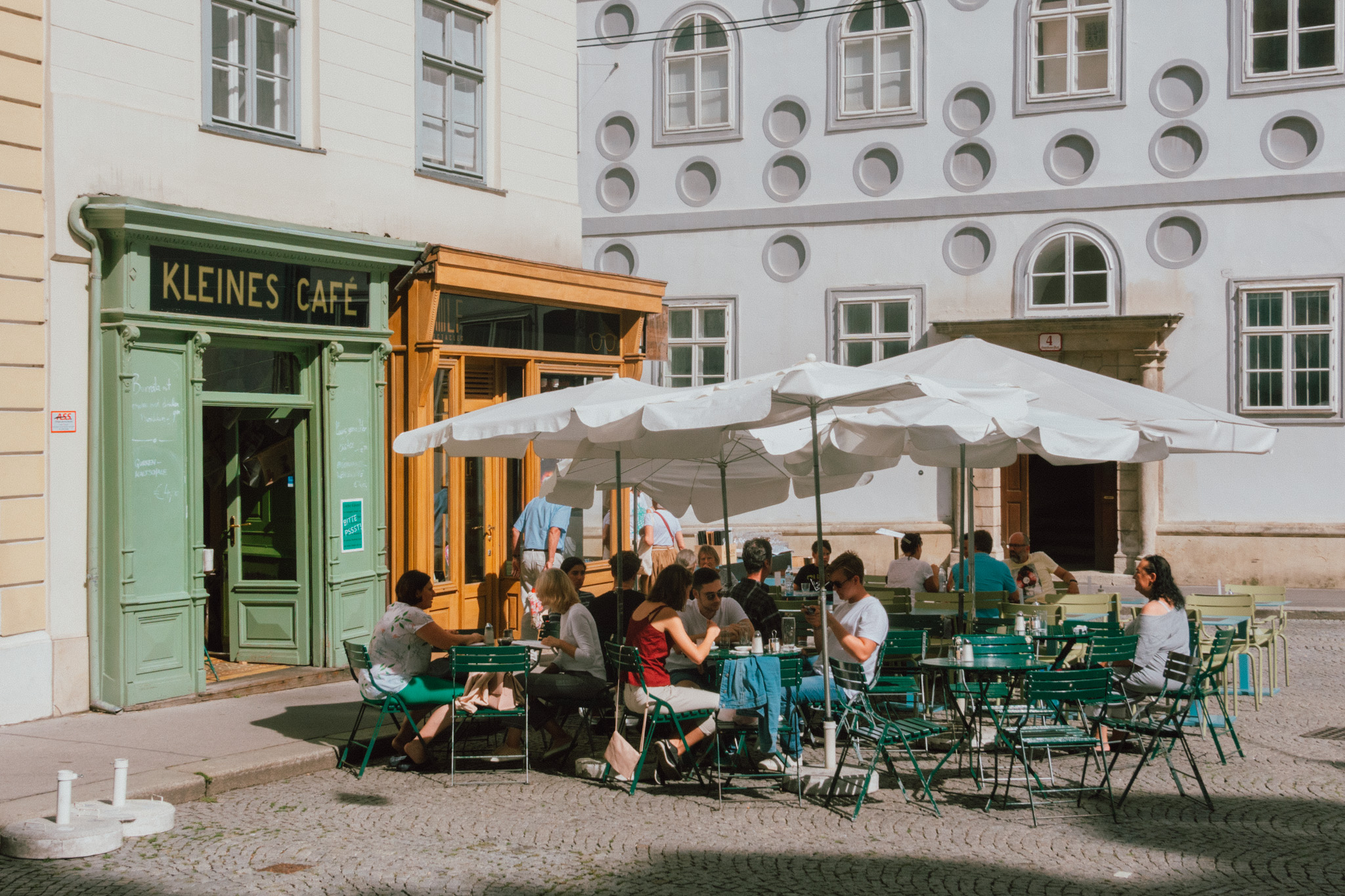 เดินชมหินแต่ละก้อน กระจกแต่ละบาน ของวิหารจนตาแทบหลุด เราขอมาแวะพักเบรคที่ร้าน Kleines Cafe’ ร้านกาแฟเล็ก ๆ ที่คงความคลาสสิคแบบเวียนนาไว้ตั้งแต่ปี ค.ศ 1970 หรือกว่า 46 ปีมาแล้ว และแม้จะตั้งอยู่ท่ามกลางคาเฟ่สุดคลาสสิกมากมายหลายแห่ง แต่เราก็จงใจเลือกที่นี่ให้เป็นหนึ่งในลิสต์ห้ามพลาดของทริป เพราะว่ามันคือหนึ่งในสถานที่ถ่ายทำหนังเรื่องโปรดตลอดกาลของเราอย่าง Before Sunrise หนังรักแนวโรแมนติกดราม่าที่มีเนื้อเรื่องเรียบง่าย เกี่ยวกับการพบเจอกันของสองนักเดินทางต่างที่มา แต่กลับเจอกันที่เมืองสุดโรแมนติกอย่างเวียนนาและก่อกำเนิดเป็นความรักที่ใช้เวลาเพียงหนึ่งวัน การจิบกาแฟของเราในครั้งนี้ จึงเป็นการจิบกาแฟไปพร้อม ๆ กับความหวังว่า อาจจะได้เจอใครสักคนในที่แห่งนี้