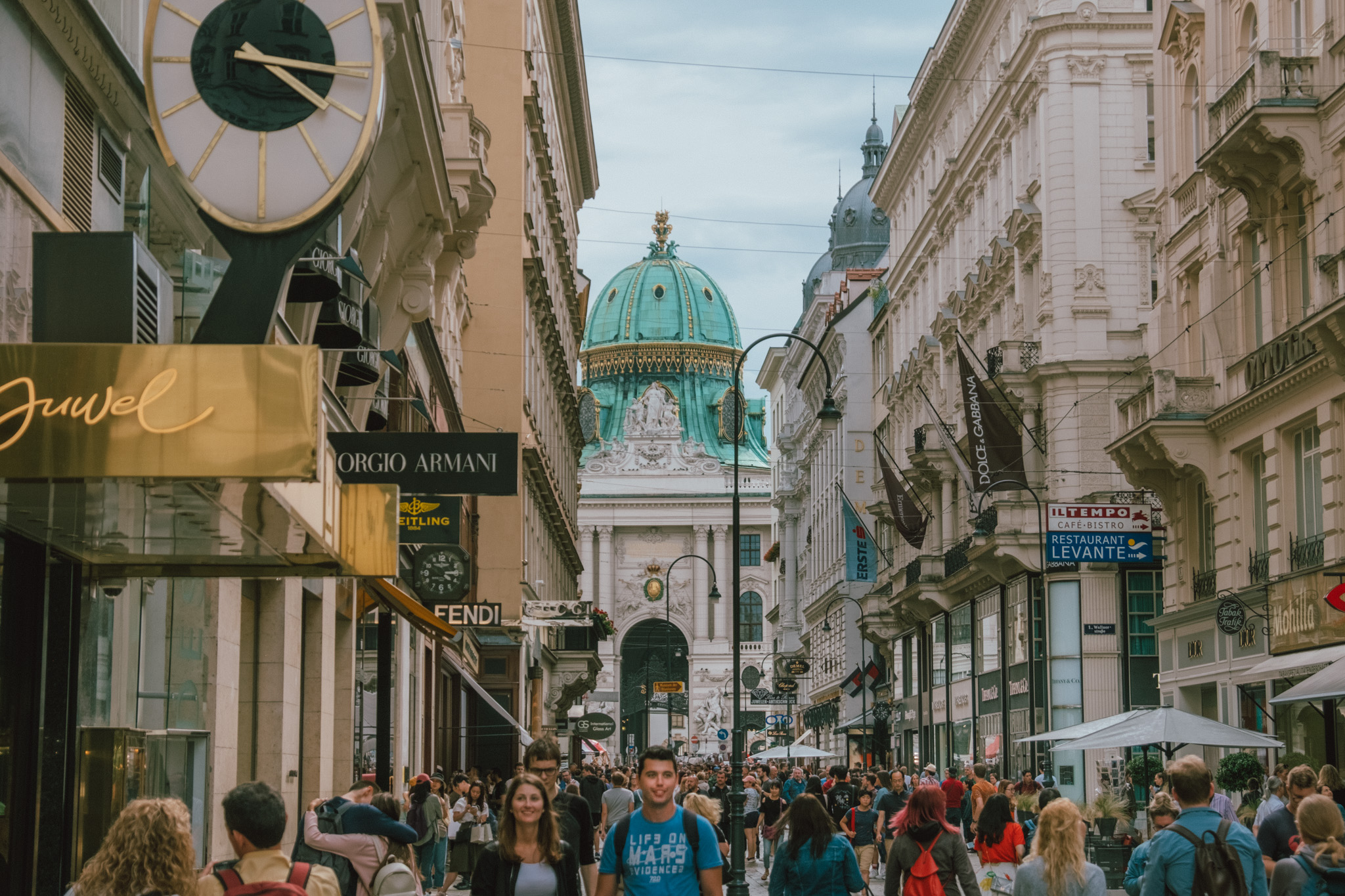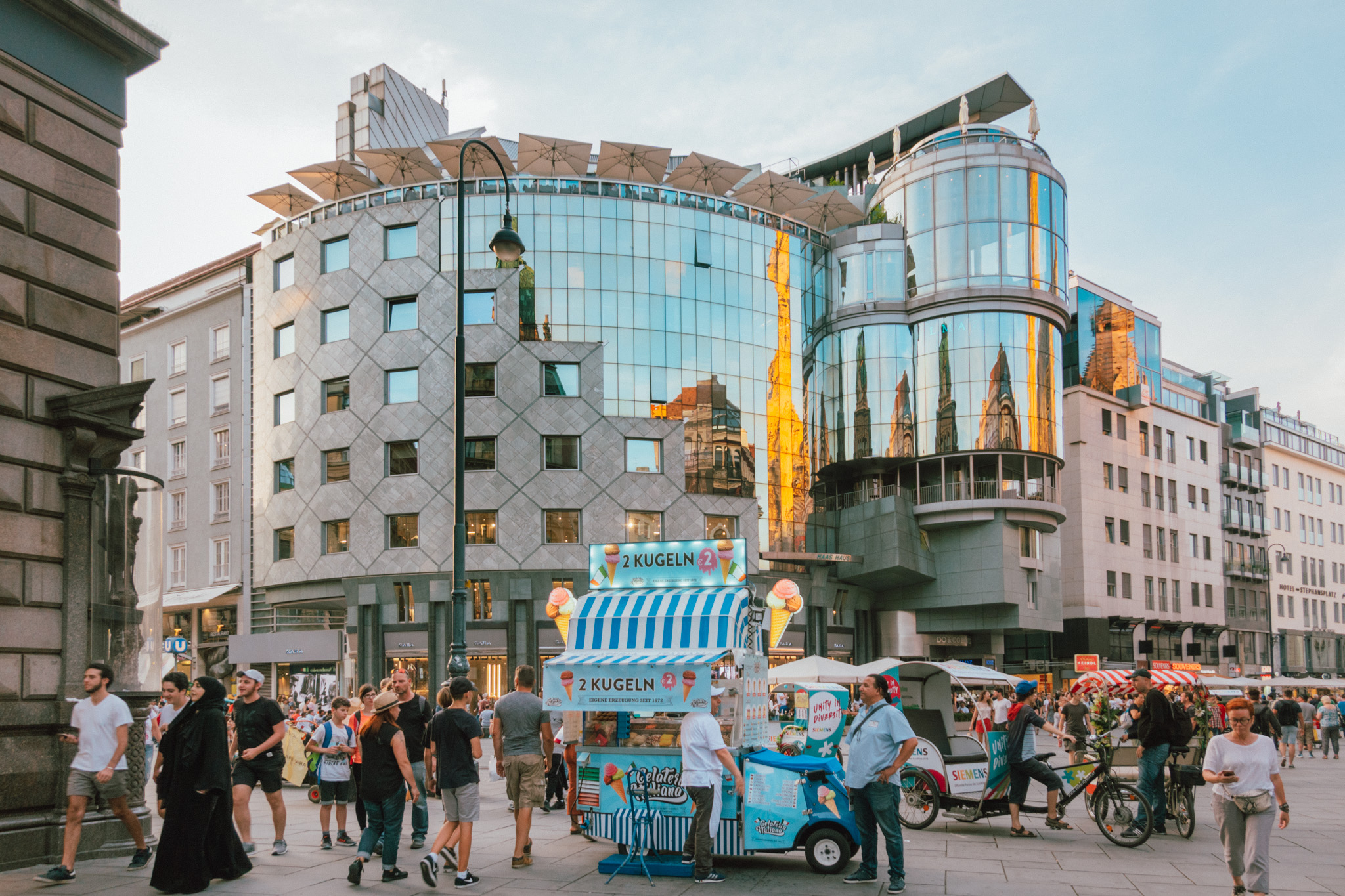 ตะวันตรงหัวก็ได้เวลาที่เราจะเริ่มเที่ยว โดยเราจะขอเริ่มกันที่ย่านสุดคึกคักอย่าง Stephansplatz แลนด์มาร์คหลักสำหรับสายช้อบแนวไฮเอนด์ เพราะนี่คือใจกลางภูมิศาสตร์ของเวียนนาที่คราคร่ำไปด้วยความหรูหราของร้านค้าแบรนด์เนมระดับโลก และตึกรามบ้านช่องที่อลังการงานสร้างไม่แพ้กัน บนถนนที่แสนจะคึกคักแห่งนี้เต็มไปด้วยนักแสดงศิลปะ รถเทียมม้า นักท่องเที่ยวที่มาอยู่รวมกันแบบไม่ต้องนัดหมาย เพื่อเข้าชมสถานที่ประวัติศาสตร์หลาย ๆ แห่ง อีกทั้งเพื่อมองหากาแฟรสเยี่ยมในช่วงกลางวัน และทานอาหารเลิศรสที่ร้านโก้หรูในช่วงกลางคืน ส่วนตัวเราขอเลือกนั่งในคาเฟ่เด็ด ๆ สักร้าน ใช้เวลาครู่หนึ่งเฝ้ามองโลกผ่านหน้าเลนส์ เพื่อเก็บภาพแลนด์มาร์คของเมืองในย่านช้อปปิ้งที่ดีที่สุดแห่งนี้