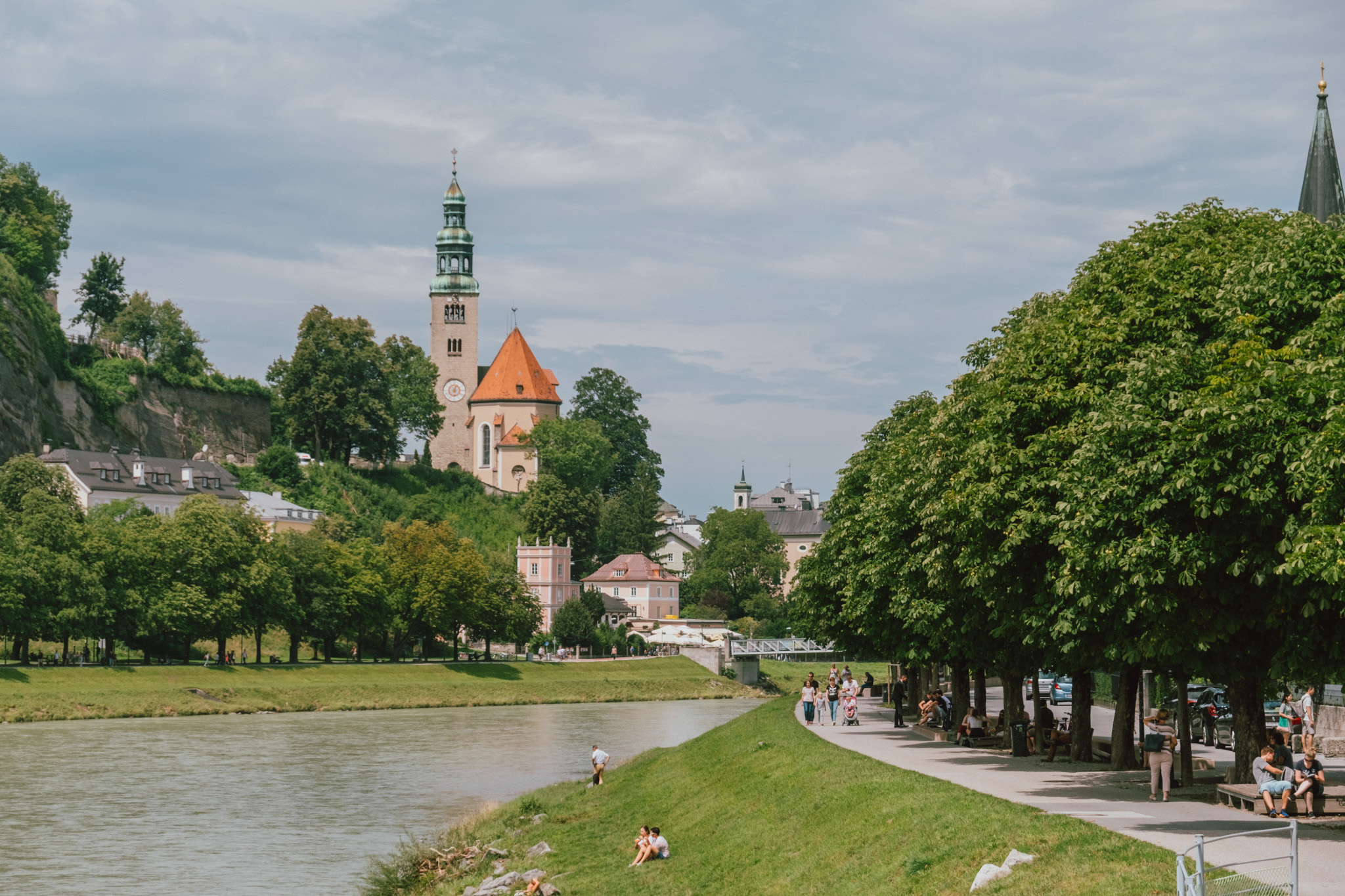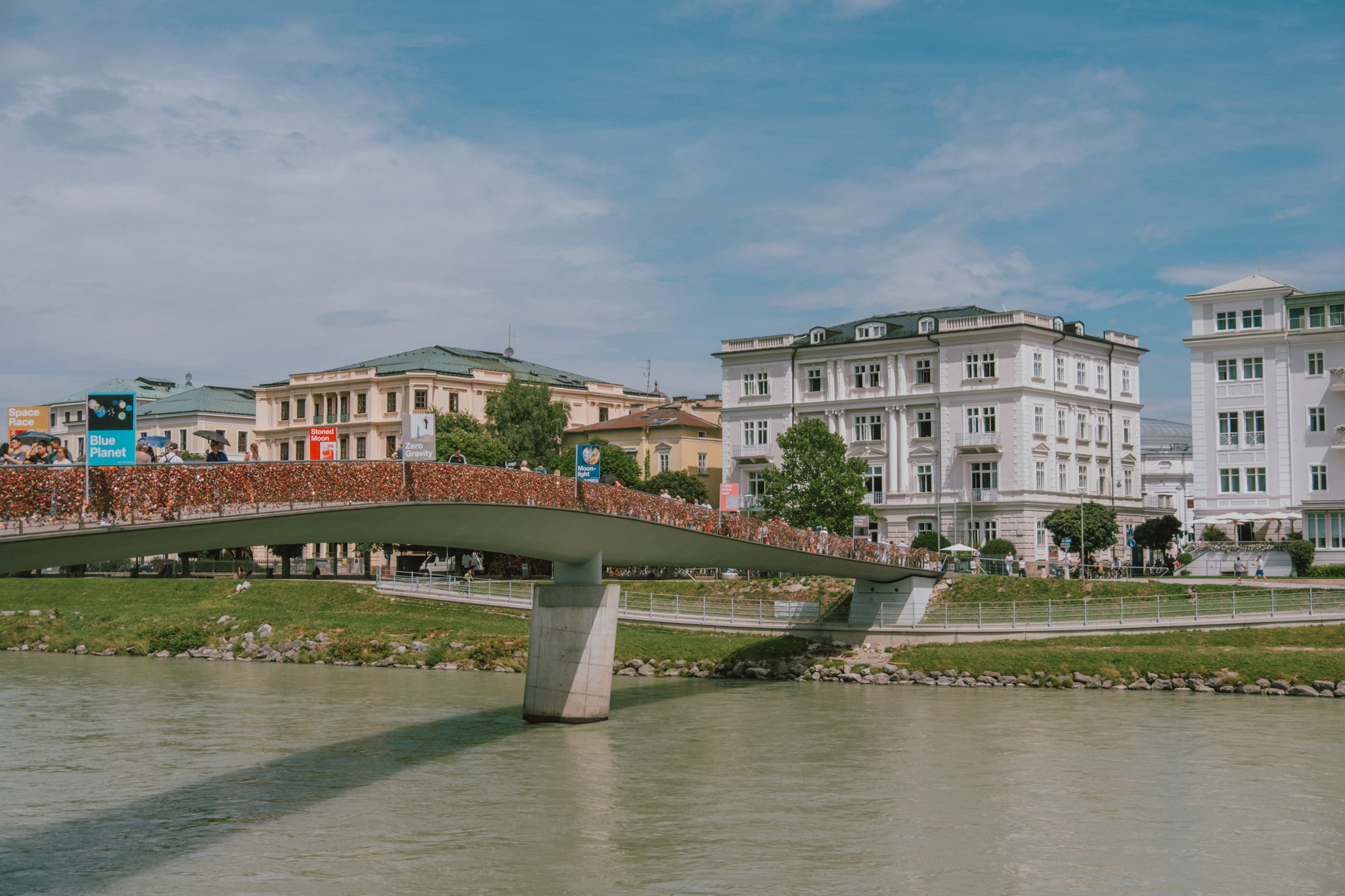 ถ่ายรูปเรื่อยเปื่อยจนเมื่อยนิ้ว เราก็เดินชิว ๆ เข้าสู่ย่านเมืองเก่า โดยมีสะพานสแตนเลสข้ามแม่น้ำ Salzach หรือ Love Locks Bridge Salzburg เป็นตัวเชื่อม สะพานแห่งนี้ถือเป็นอีกหนึ่งสัญลักษณ์ของเมืองที่สังเกตได้ง๊ายง่าย ผ่านแม่กุญแจนับร้อยนับพันที่ถูกเอามาคล้องไว้โดยคู่รักที่เดินทางจากทั่วโลก อากาศก็ดี๊ดี บรรยากาศก็อบอวลไปด้วยความโรแมนติก รอบข้างก็ดูสะอาด สงบ ปลอดภัย ทำให้เรารู้สึกว่าเวลาเดินช้าลงกว่าวันยุ่ง ๆ ในเมืองกรุงบ้านเราเป็นอย่างมาก