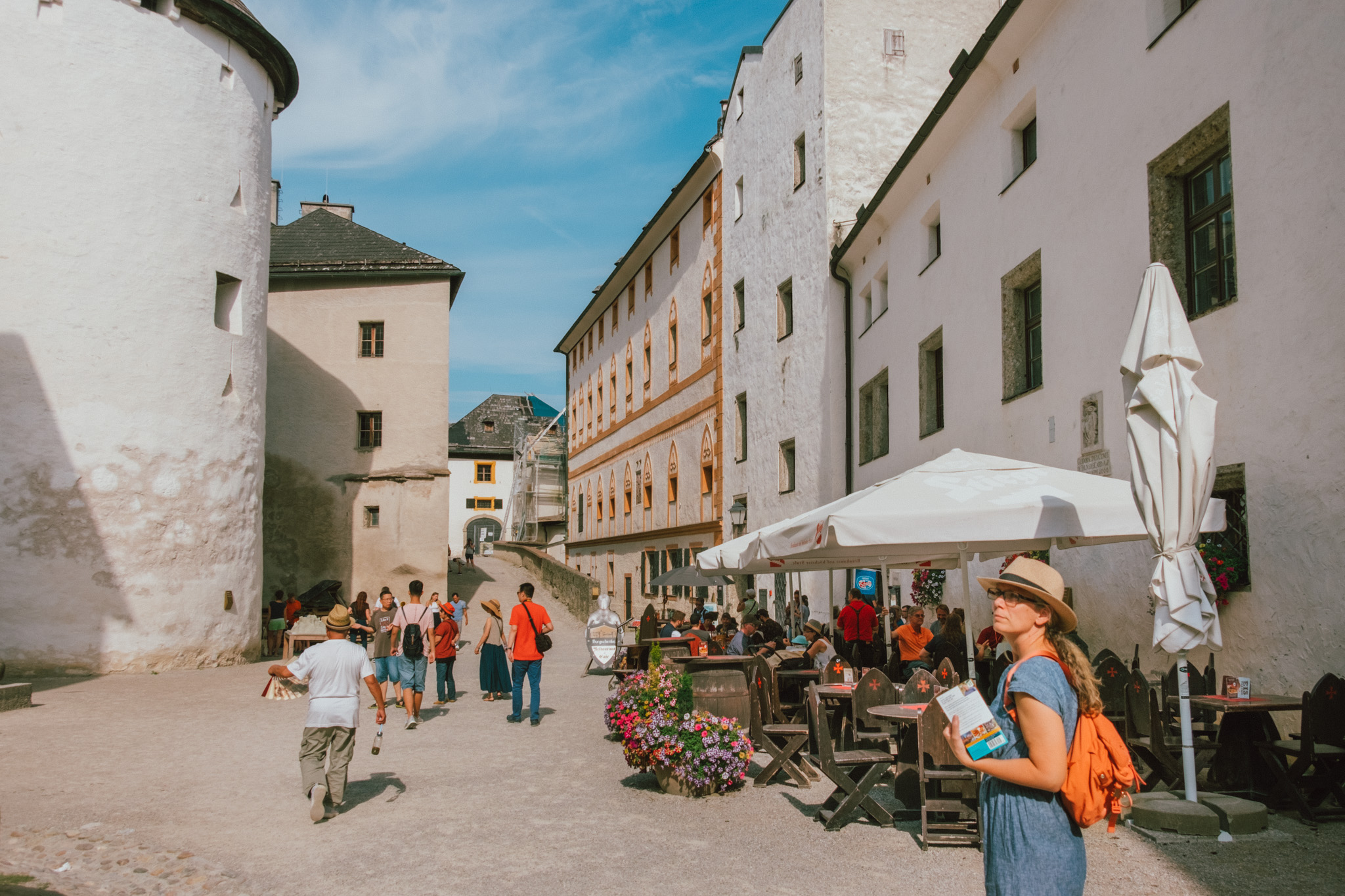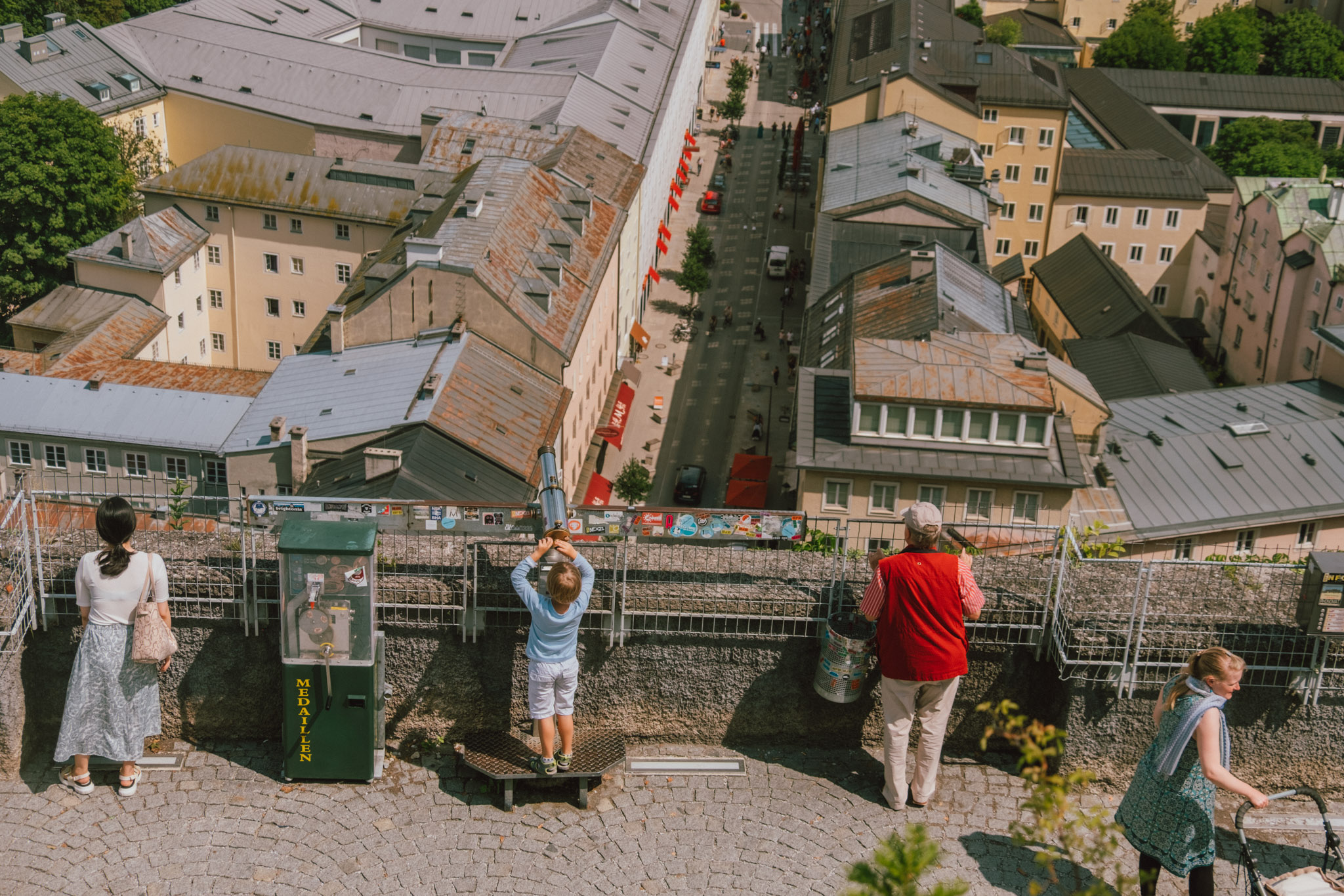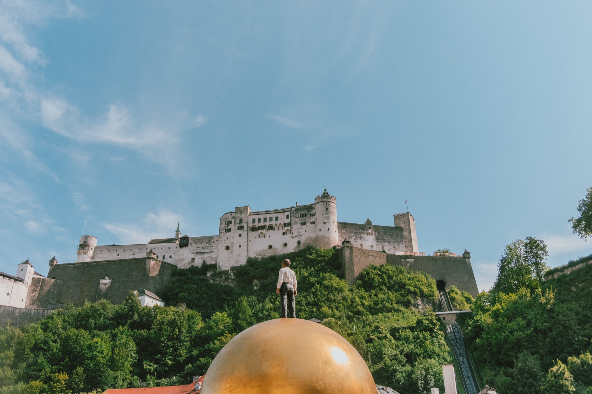 ปิดท้ายกับการนั่งกระเช้าขึ้นไปยังจุดชมวิวที่สวยที่สุด สูงที่สุด ที่เรามองเห็นมันผ่านมิวเซียมไปเมื่อกี้นั่นก็คือ Festung Hohensalzburg ป้อมปราการแห่งยุคกลางบนยอดเขาที่มีขนาดใหญ่ที่สุดแห่งหนึ่งของยุโรป ที่มีอายุกว่า 500 ปี อดีตป้อมปราการ ที่พำนักส่วนตัว เรือนจำ และค่ายทหารของอาร์ชบิชอป Gebhard ด้านในประกอบด้วยห้องต่าง ๆ มากมาย ไม่ว่าจะเป็นห้องเสวยพระกระยาหาร ห้องบรรทม โถงทองคำ ที่ล้วนแล้วแต่ถูกออกแบบในสไตล์โกธิคอย่างปราณีตบรรจงโดยที่ทุกอย่างยังคงสวยงามเหมือนเมื่อ 500 กว่าปีก่อน เพราะฉะนั้นไม่ต้องแปลกใจหากแกจะมองไปทางไหนแล้วรู้สึกตื่นเต้นไปเสียทุกมุม ก็ที่นี่น่ะให้ฟีลลิ่งของราชนิกุลแบบครบรสที่สุดแห่งหนึ่งน่ะสิ