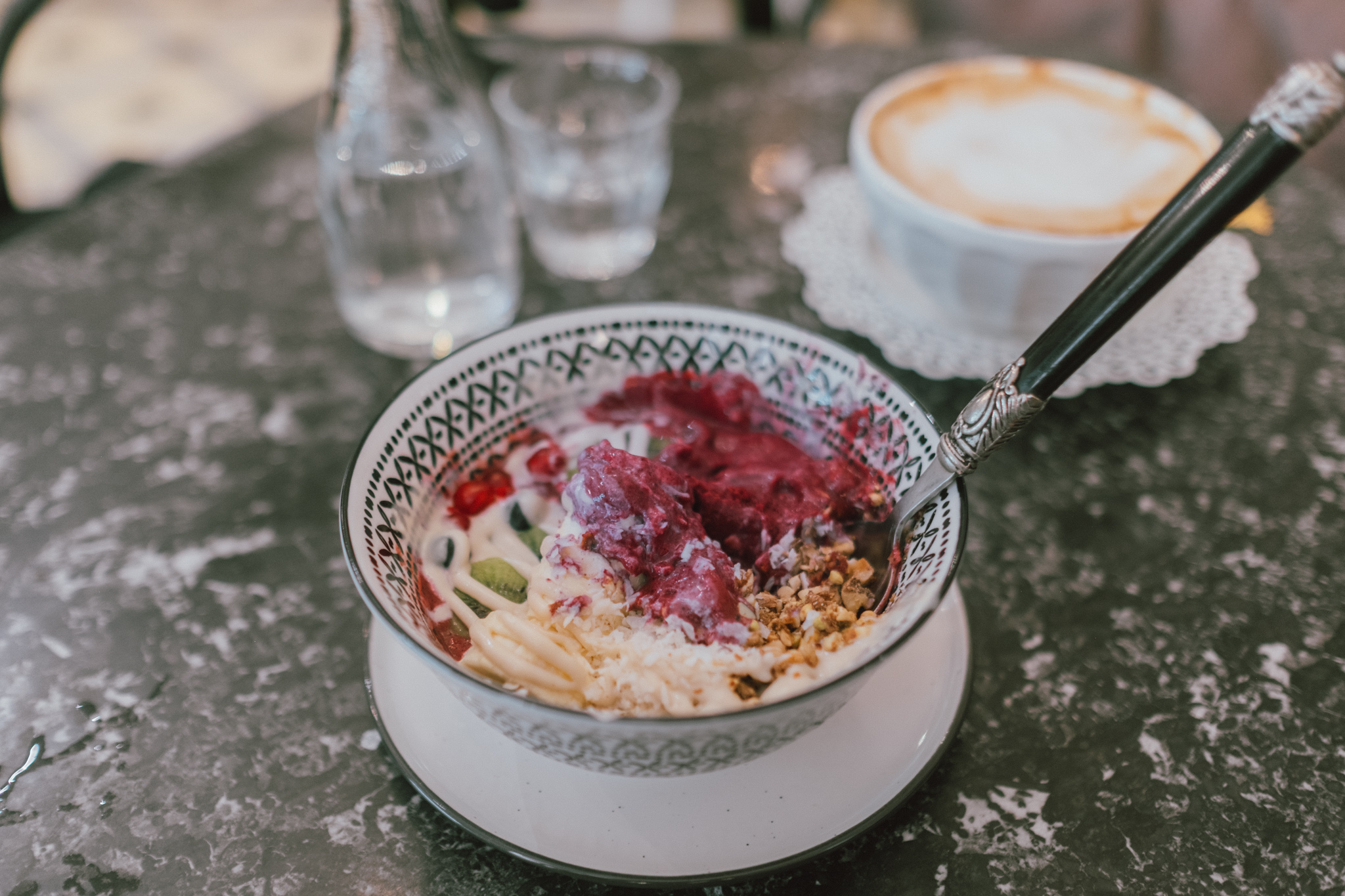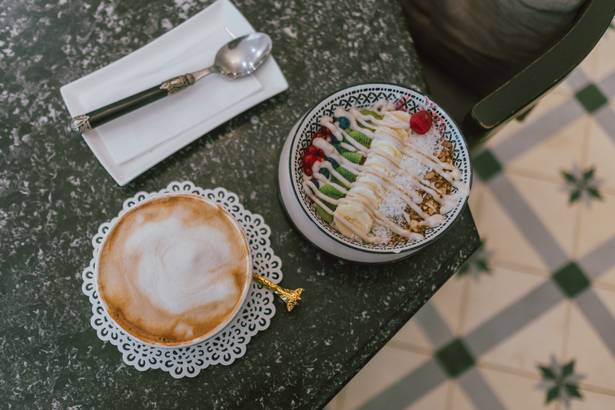 สายหมูกระทะอย่างเราขอเลือกสั่งลาเต้ที่เค้าจะใช้นมถั่วเหลืองแทนนมวัว และ Acid Bowl อาหารแนวเฮลตี้ที่นำผลไม้สดมาปั่นกับโยเกิร์ตแล้วท็อปปิ้งด้วยกาโนล่า ข้าวโอ๊ต กล้วย กีวี่ เบอร์รี่ ราดทับด้วยซอสหวาน ๆ บางอย่างอีกหนึ่งอย่างเป็นอันจบ ชามนี้บอกเลยว่าแค่รูดจ่ายเงินผ่าน PLANET SCB รับมาตั้งถ่ายรูปก็รู้สึกสุขภาพดีโดยที่ยังไม่ทันเอาเข้าปากแล้วจ้าแม่