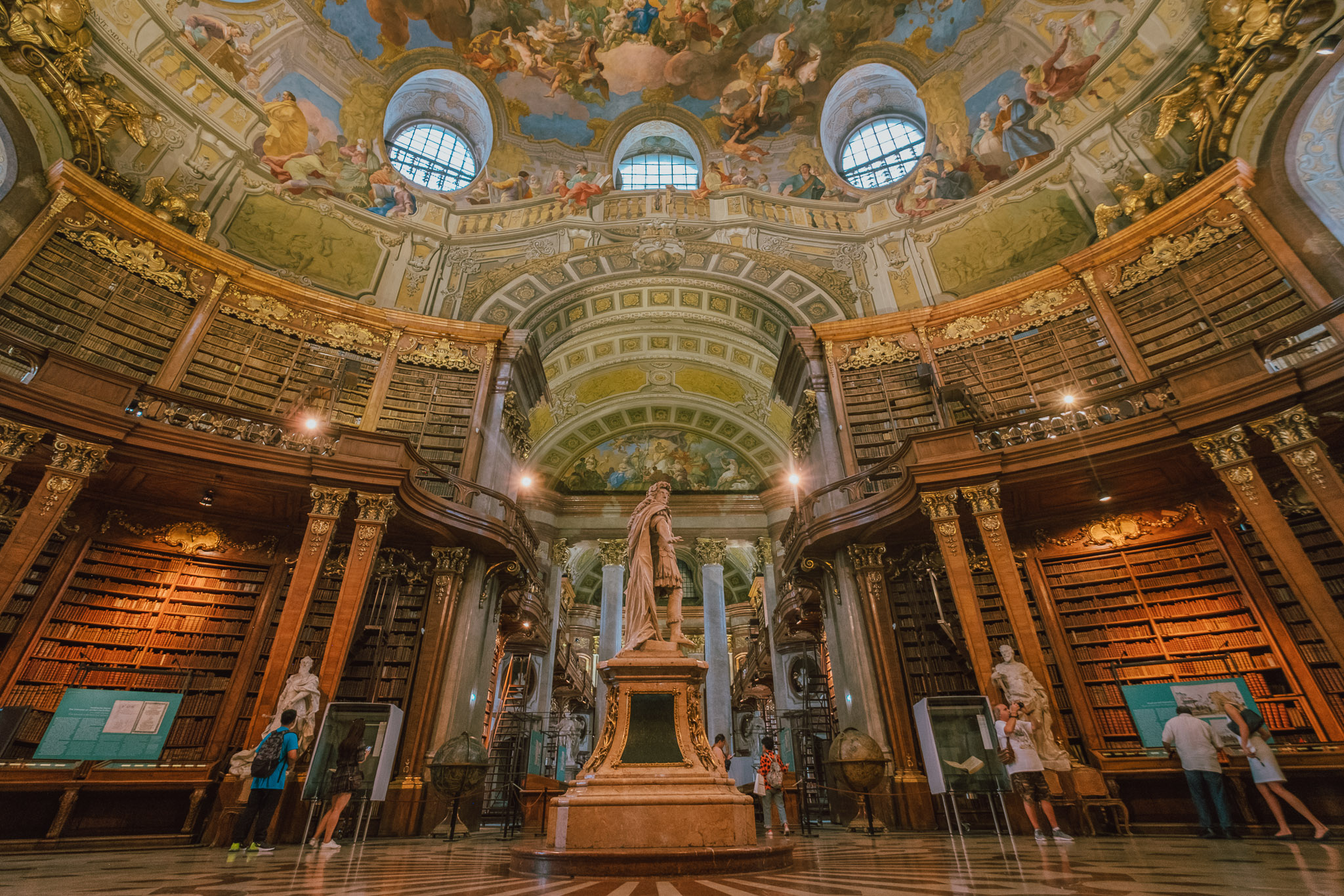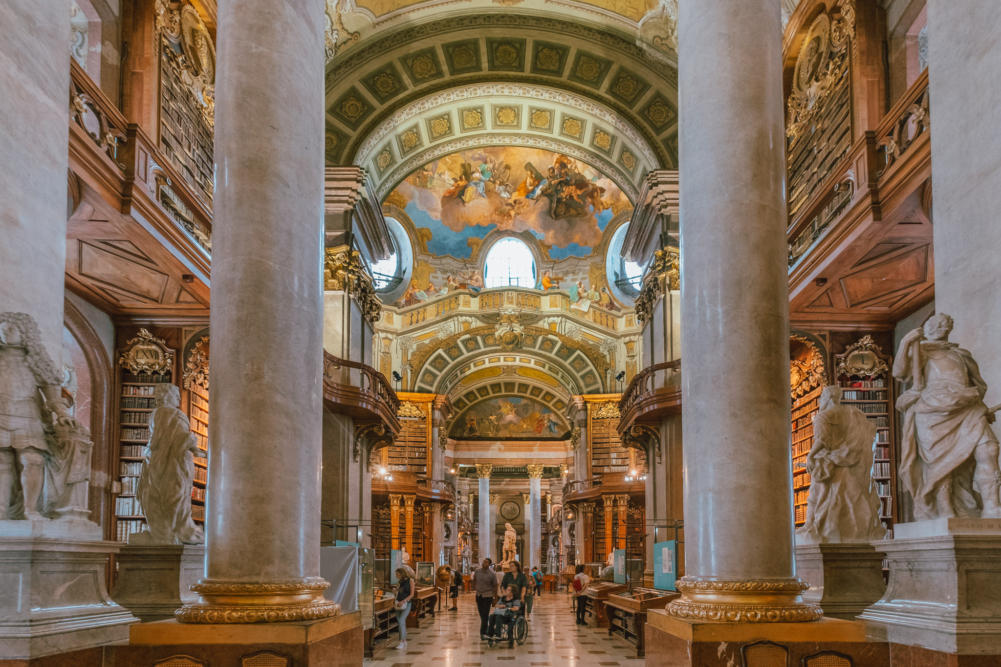 พอสายหน่อย ที่เที่ยวเริ่มเปิด เราก็ไปเช็คอินที่แรกกับห้องสมุดที่สวยมาก โอ้ย!!! เป็นอีกที่แล้วสินะที่เราจะใช้คำว่าสวยได้สิ้นเปลือง แต่มันก็สวยจนไม่มีคำไหนจะบรรยายได้ดีเท่ากับคำว่าสวยแล้วนี่หน่า เพราะนี่คือ Austrian National Library, State Hall ห้องสมุดแห่งชาติของออสเตรีย หนึ่งในห้องสมุดที่สวยที่สุดในโลกและถูกจัดอันดับให้เป็นห้องสมุดสไตล์บาโรกที่ใหญ่ที่สุดในยุโรปอีกด้วย ทำให้มันไม่ได้เก็บรวบรวมความรู้เท่านั้น แต่ยังเป็นที่รวบรวมศิลปะชั้นสูงตั้งแต่พื้นยันภาพวาดบนเพดาน ที่ใช้เทคนิคการวาดแบบเฟรชโก้ไว้แทบจะทุกตารางนิ้ว และด้านในก็บรรจุหนังสือกว่า 200,000 เล่ม โดยมีผลงานชิ้นสำคัญของ มาร์ติน รูเทอร์ ที่เขียนในยุคปฏิรูปไว้มากที่สุด บอกตรง ๆ ขนลุกแล้วแม่จ๋า แน่นไปด้วยความรู้ ประวัติศาสตร์ และศิลปะแบบทุกอณูเนื้อมากเวอร์