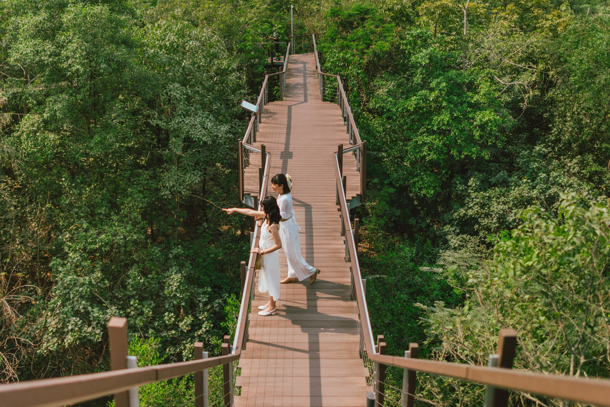 เดินลัดเลาะชมธรรมชาติแบบเพลินตา เพลินใจจน แทบจะลืมไปเลยว่าเรากำลังอยู่ในเมืองหลวงอยู่ เราก็มาถึงทางเดินชมเรือนยอดไม้หรือสกายวอล์คชมธรรมชาติ สะพานไม้ที่มีระยะทางกว่า 200 เมตรทอดตัวเหนือยอดไม้ เป็นเส้นทางที่ทำให้เราได้เห็นพื้นที่ของโครงการป่าในกรุงจากมุมสูงได้แบบถนัดตา ทั้งยังได้เห็น น้ำตกจำลองลำธารจำลอง และต้นไม้จริง ๆ น้อยใหญ่อีกหลากหลายสายพันธุ์ที่ล้วนแล้วแต่มีป้ายและรูปของต้นไม้ ที่อยู่ในบริเวณนั้นทำให้เราได้รู้จักมักจีกับต้นไม้ที่เราเห็นมากยิ่งขึ้น