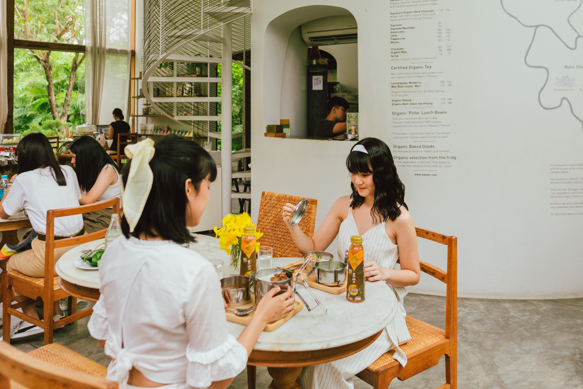 นอกจากด้านนอกจะโปร่งโล่งสบายแล้ว ภายในก็กว้างขวางให้ความรู้สึกสบายไม่แพ้กัน เพราะนอกจากแสงแดดอ่อน ๆ ที่ลอดผ่านม่านสีขาวแล้ว เฟอร์นิเจอร์สีอ่อน ๆ แบบธรรมชาติก็ชวนให้รู้สึกสบายอย่างบอกไม่ถูก ภายในร้านก็เป็นแบบ self service ตั้งแต่สั่งอาหาร รับอาหาร เก็บอาหาร แยกขยะ ให้ฟีลเหมือนกลับไปเป็นเด็กนักเรียนอีกครั้ง แต่บรรยากาศดีต่างกันมาก ส่วนเรื่องอาหารก็ยืนหนึ่งไปเลยจ้า เพราะเมนูของร้านปรุงสดใหม่ทุกวันจากวัตถุดิบออแกนิคมาตราฐานสากลจากกลุ่มเกษตรกร ทานเสร็จสบายทั้งกาย สบายทั้งใจ กันเลย