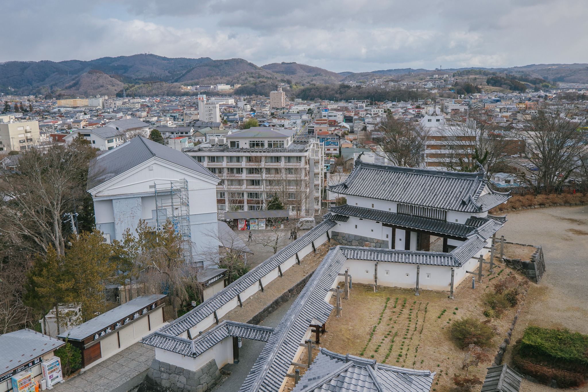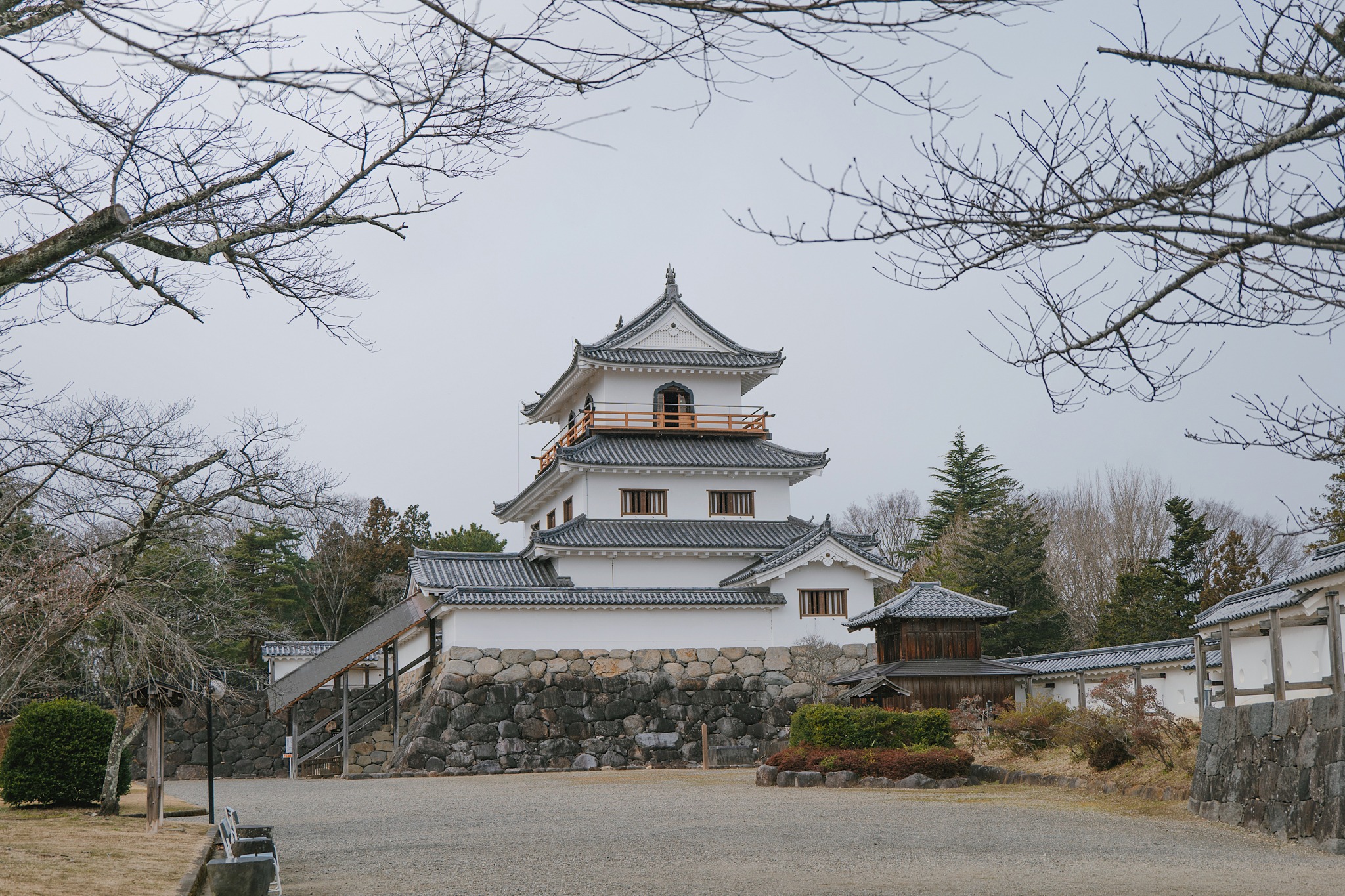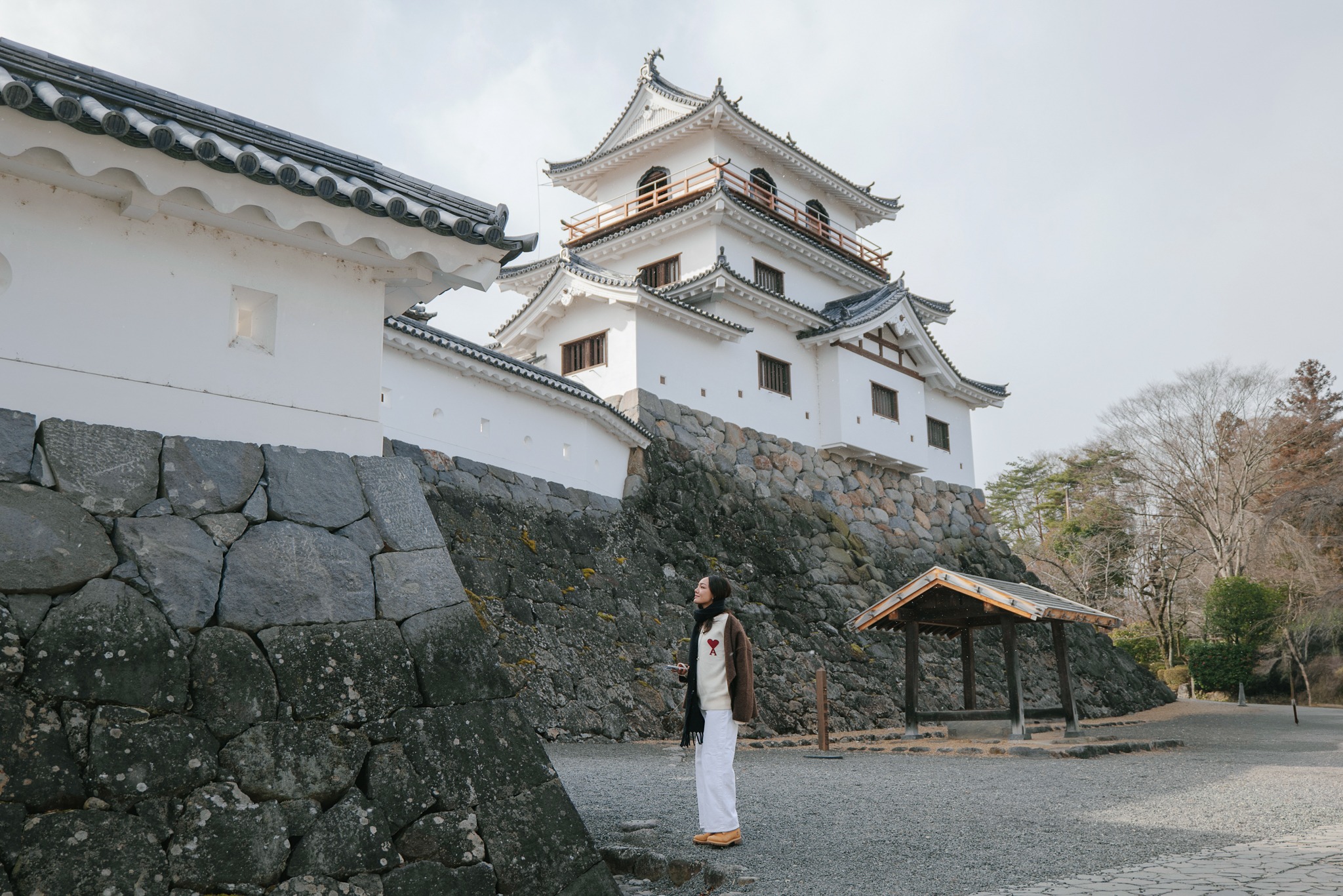 รอบตัวปราสาทถูกจัดเป็นสวนสาธารณะ Masuoka Park ที่ปลูกต้นซากุระกว่า 400 ต้นหลากหลายสายพันธุ์ เช่น Somei Yoshino, Shidarezakura และ Yaezakura จึงเป็นหนึ่งในจุดชมซากุระยอดนิยมของเมืองในฤดูใบไม้ผลิ ส่วนช่วงที่เราไปเยือนยังคงเป็นบรรยากาศหน้าหนาว สวนจะเงียบสงบ โปร่งโล่ง ต้นไม้ผลัดใบเผยให้เห็นเส้นสายของกิ่งก้านตัดกับตัวปราสาทสีขาวแดงอย่างชัดเจน แม้จะไม่มีหิมะปกคลุมหนาเหมือนที่เคยเจอรอบก่อน แต่ความนิ่งและอากาศเย็นก็ช่วยขับให้บรรยากาศดูขรึม สงบ และมีเสน่ห์ไปอีกแบบ ช่วงกลางคืนยังมีการประดับไฟ เพิ่มความอบอุ่นให้โลเคชันแห่งนี้ ที่นี่จึงเป็นพื้นที่ที่ผสานประวัติศาสตร์ วัฒนธรรม และธรรมชาติได้อย่างลงตัว และเป็นมุมถ่ายรูปยอดนิยมของทั้งชาวญี่ปุ่นและนักท่องเที่ยว