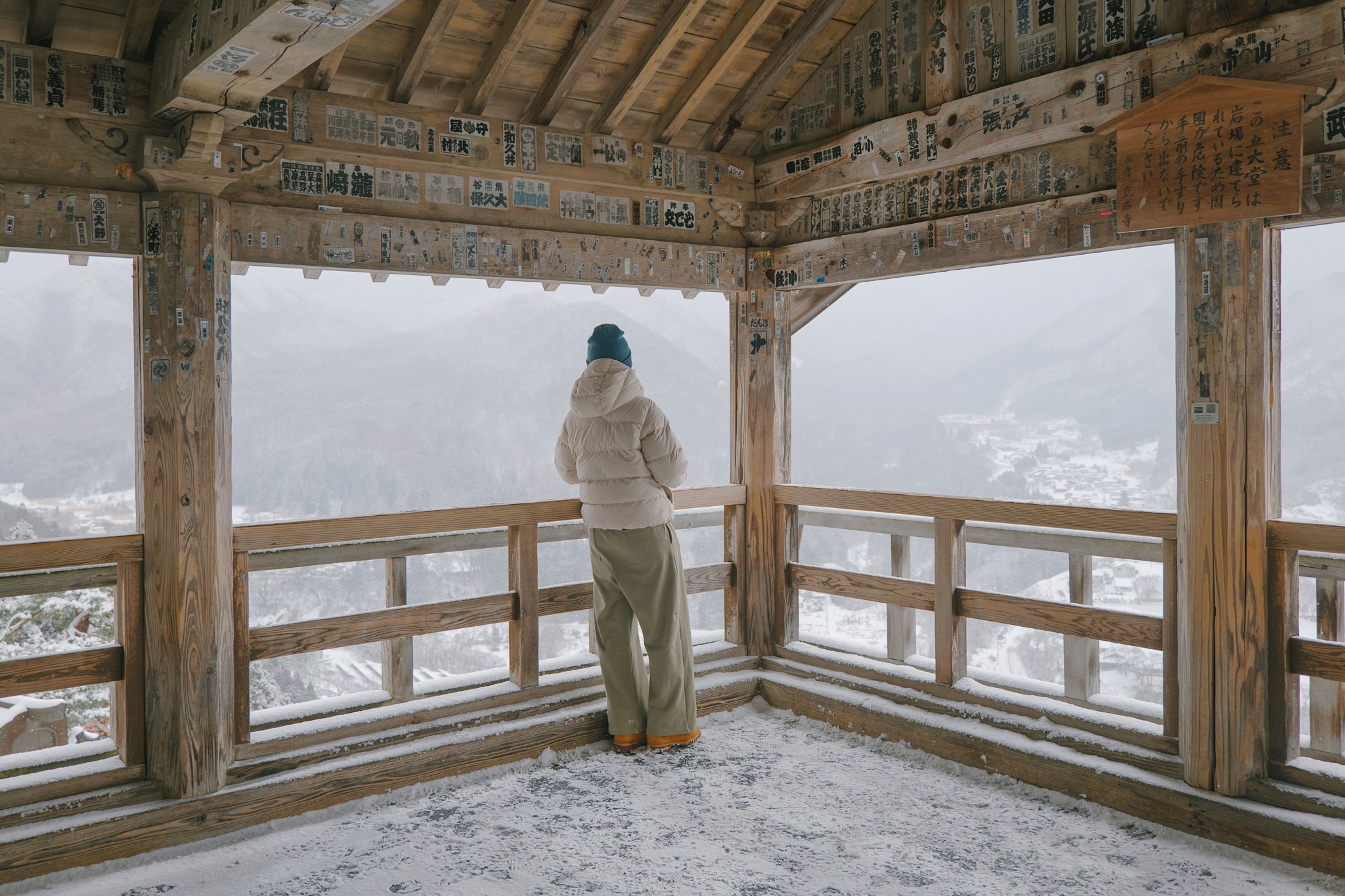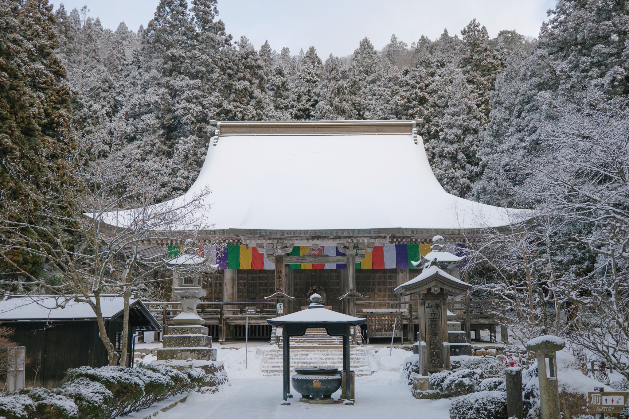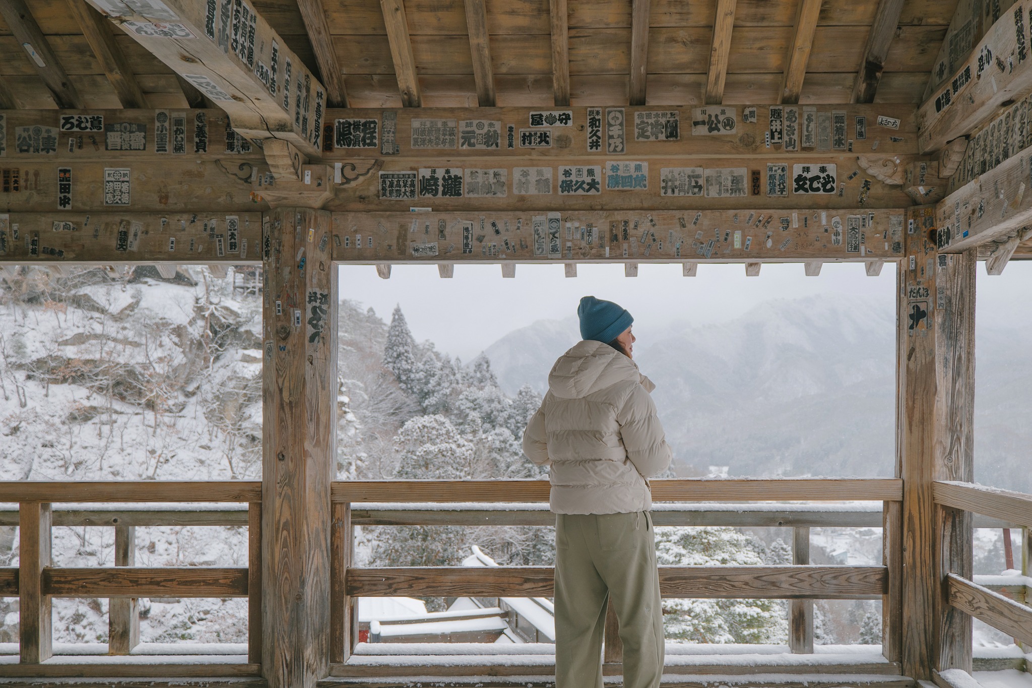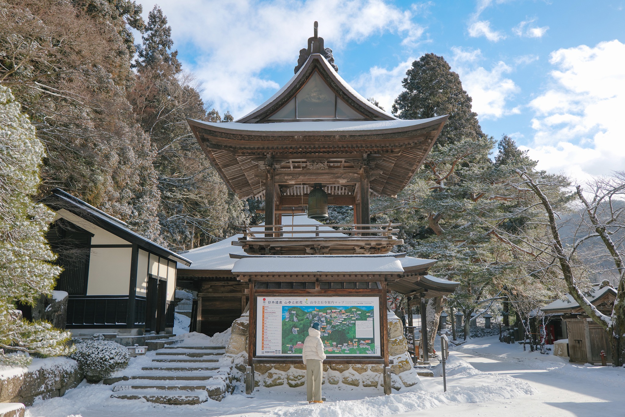 และไม่ต้องกลัวว่าจะเหนื่อยจนหอบแบบหมดสนุก เพราะตลอดเส้นทาง เขามีจุดพักให้เราได้หายใจหายคอ พร้อมความงดงามของโบราณสถานเก่าแก่ให้เราหยุดดู อาทิ ประตูไม้ อาคาร ศาลเจ้า หินขนาดมหึมามากมาย โดยรวมแล้วเราใช้เวลาไปเกือบชั่วโมง จนมาถึงจุดไคลแมกซ์ ‘Godaido Hall’ บริเวณริมผาที่มีหินก้อนใหญ่ พร้อมศาลาสีแดงฉานตั้งอยู่อย่างโดดเด่น ซึ่งถือเป็นจุดชมวิวที่สวยที่สุดของวัดนี้ เป็นวิวพาโนราม่าเห็นหุบเขาขาวสะอาด สลับทับซ้อนไปไกลสุดตา พร้อมหมู่บ้านเล็ก ๆ ที่อยู่ตรงกลาง ยามฤดูหนาวเราจะเห็นไอร้อนจากบ้าน การเคลื่อนตัวของรถยนต์ได้อย่างชัดเจน มองไปมองมาแล้วเหมือนเมืองตุ๊กตาในฝันเลย