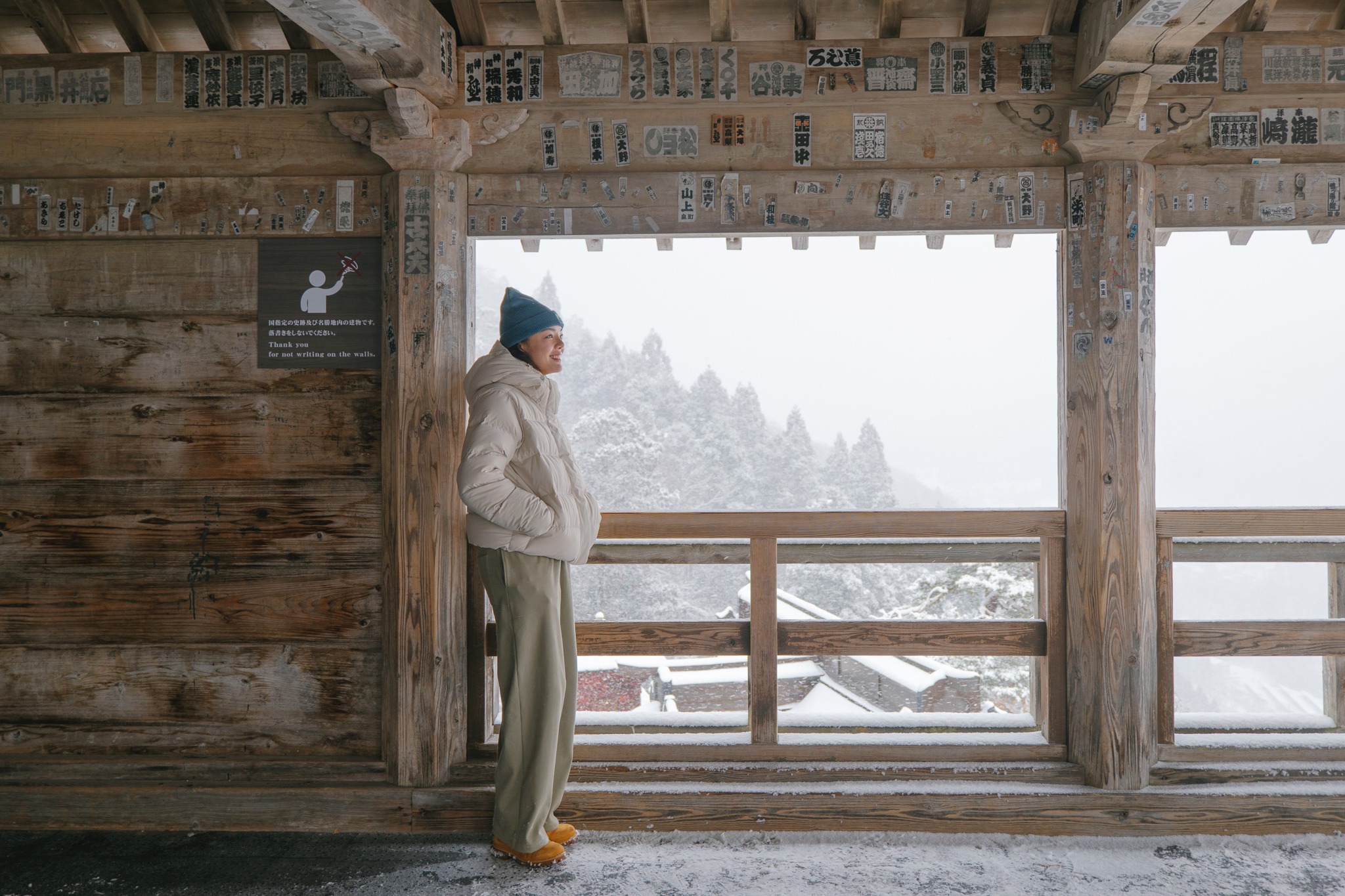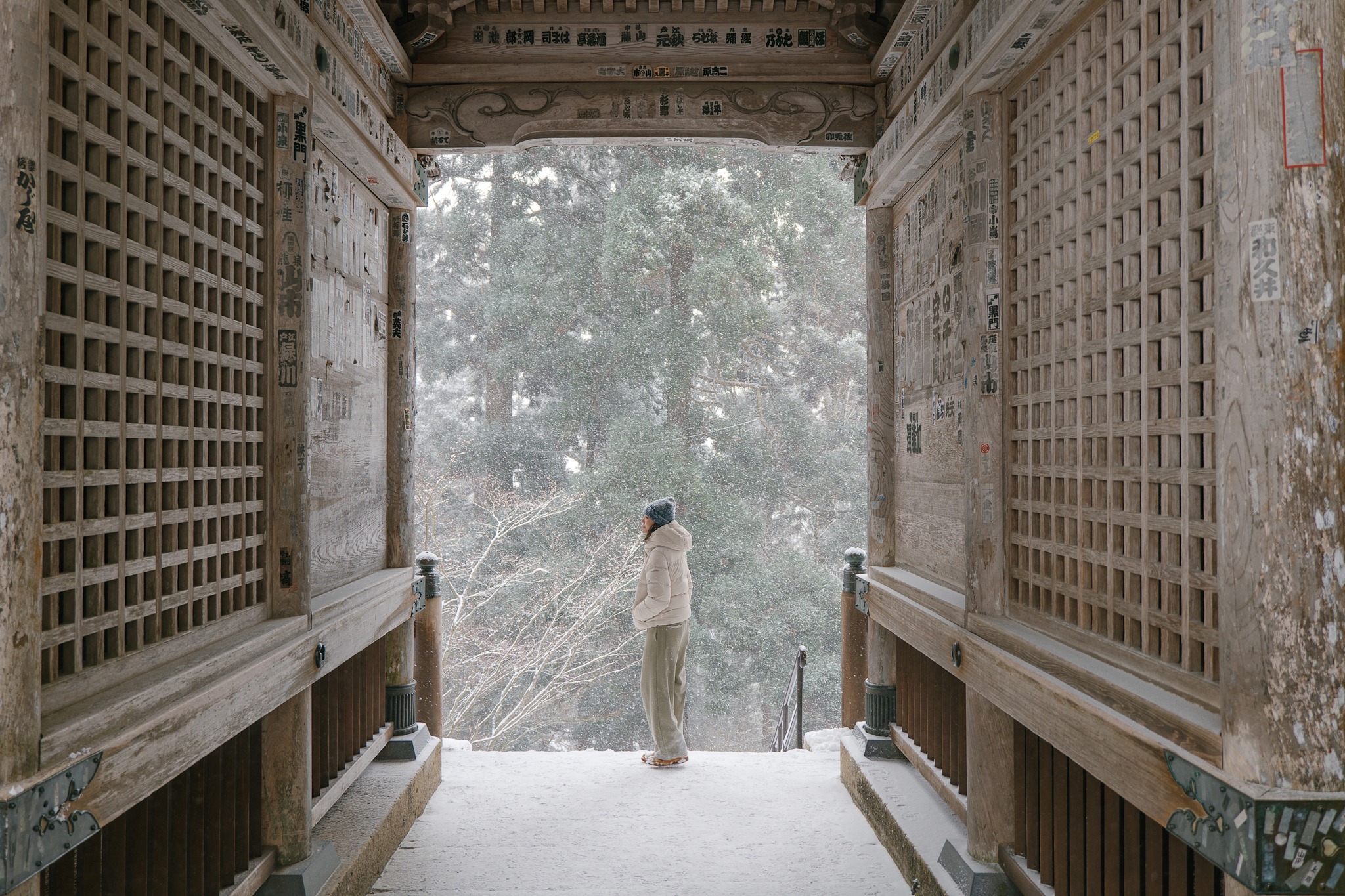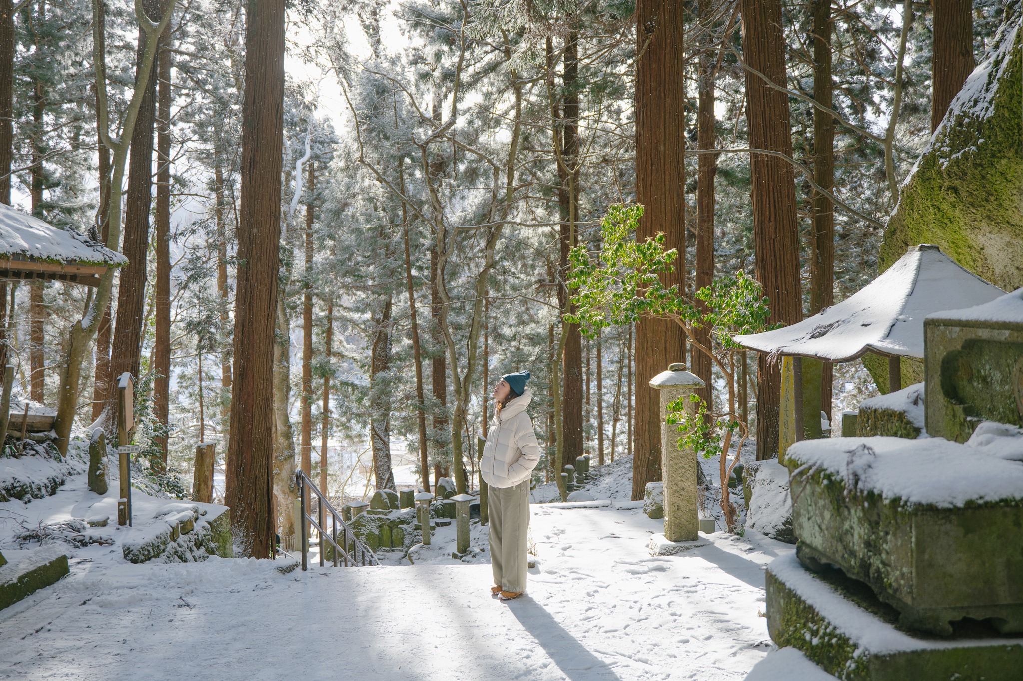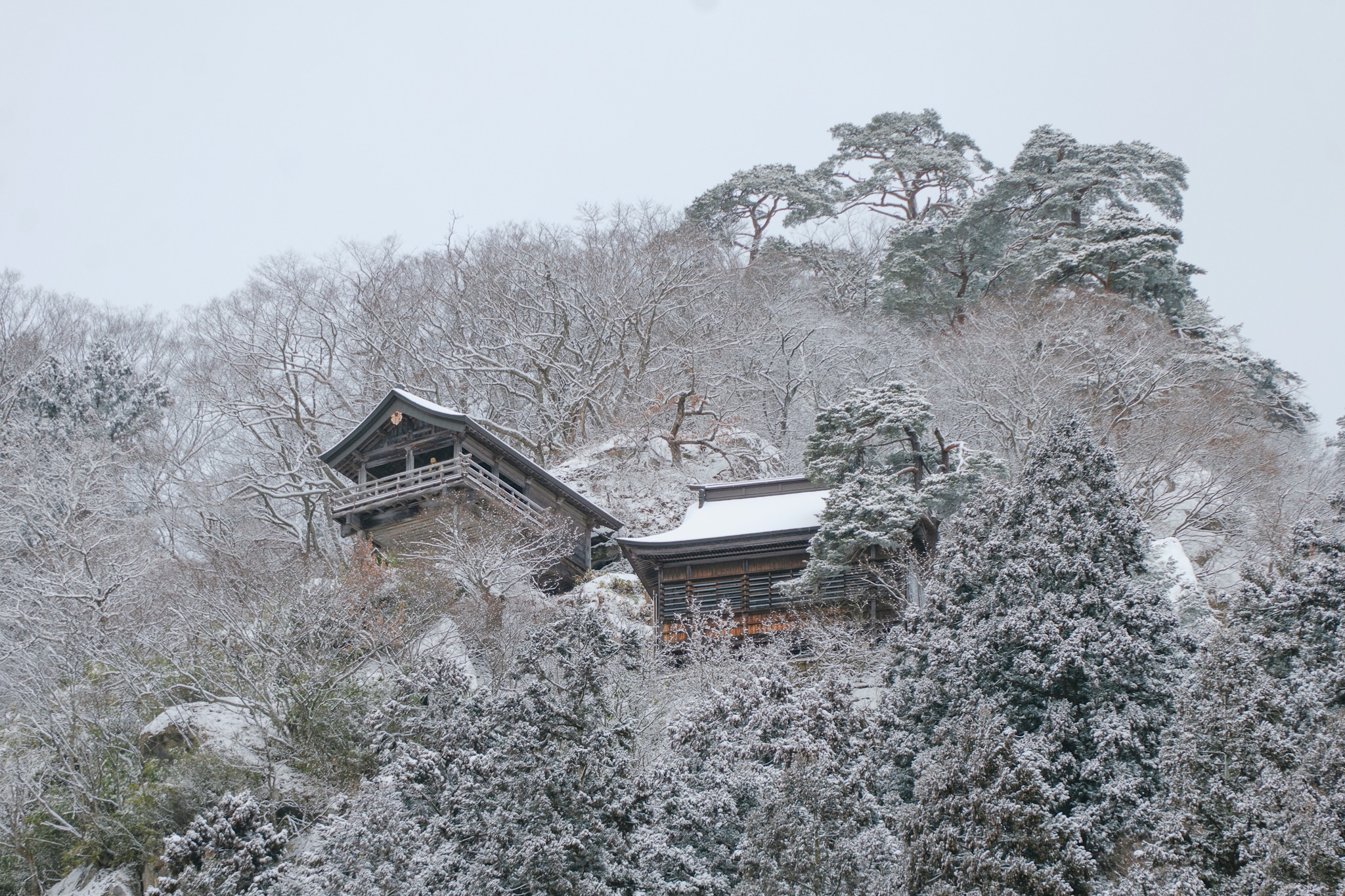 และไม่ต้องกลัวว่าจะเหนื่อยจนหอบแบบหมดสนุก เพราะตลอดเส้นทาง เขามีจุดพักให้เราได้หายใจหายคอ พร้อมความงดงามของโบราณสถานเก่าแก่ให้เราหยุดดู อาทิ ประตูไม้ อาคาร ศาลเจ้า หินขนาดมหึมามากมาย โดยรวมแล้วเราใช้เวลาไปเกือบชั่วโมง จนมาถึงจุดไคลแมกซ์ ‘Godaido Hall’ บริเวณริมผาที่มีหินก้อนใหญ่ พร้อมศาลาสีแดงฉานตั้งอยู่อย่างโดดเด่น ซึ่งถือเป็นจุดชมวิวที่สวยที่สุดของวัดนี้ เป็นวิวพาโนราม่าเห็นหุบเขาขาวสะอาด สลับทับซ้อนไปไกลสุดตา พร้อมหมู่บ้านเล็ก ๆ ที่อยู่ตรงกลาง ยามฤดูหนาวเราจะเห็นไอร้อนจากบ้าน การเคลื่อนตัวของรถยนต์ได้อย่างชัดเจน มองไปมองมาแล้วเหมือนเมืองตุ๊กตาในฝันเลย