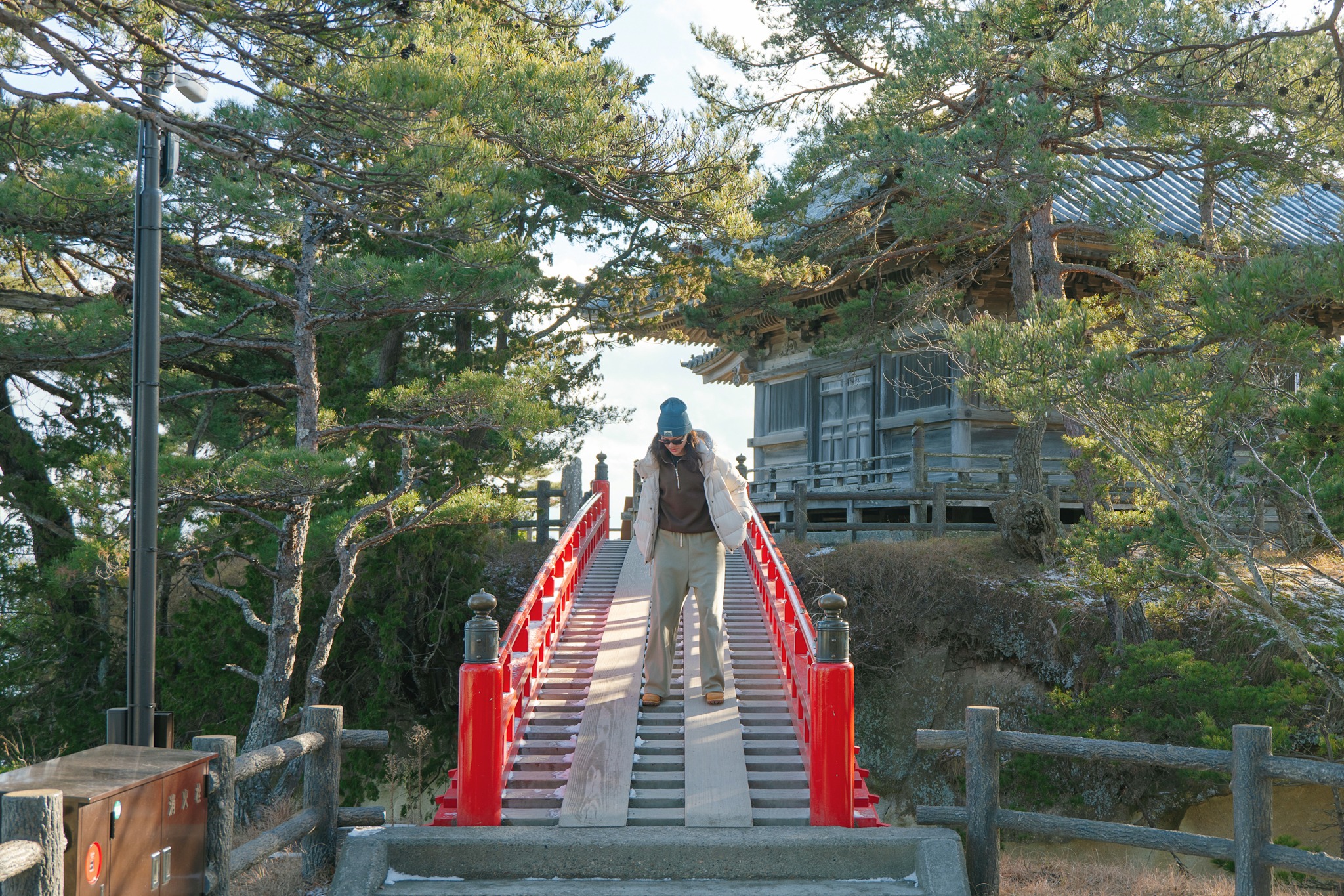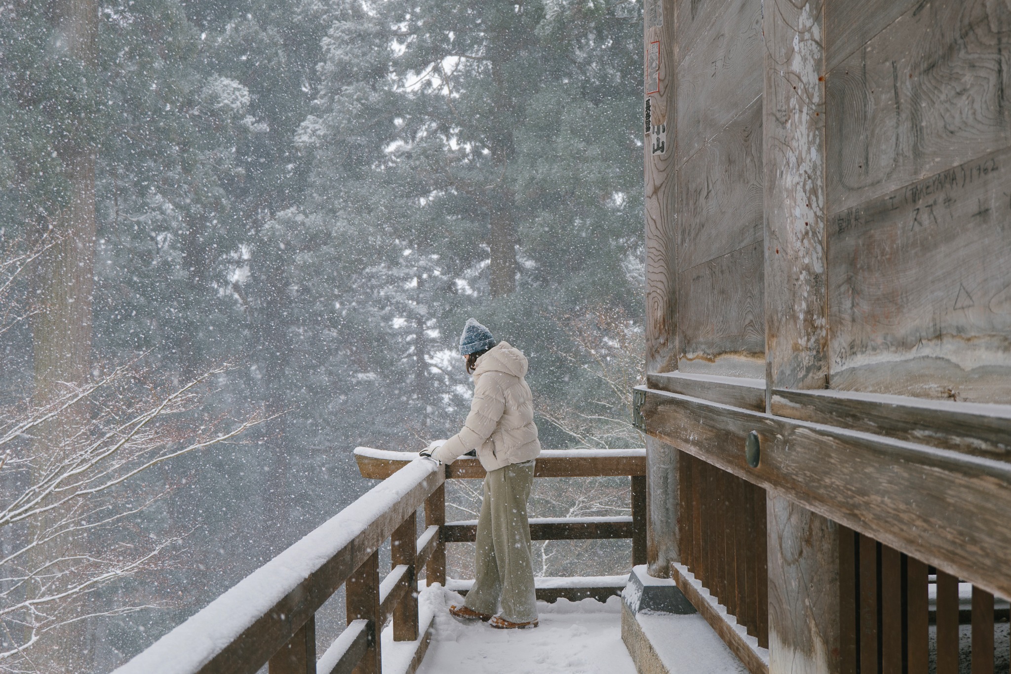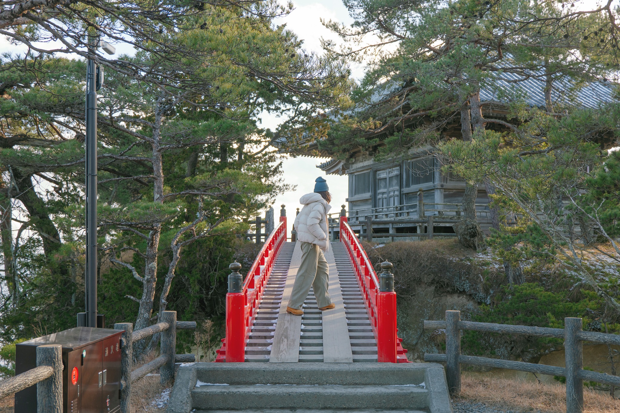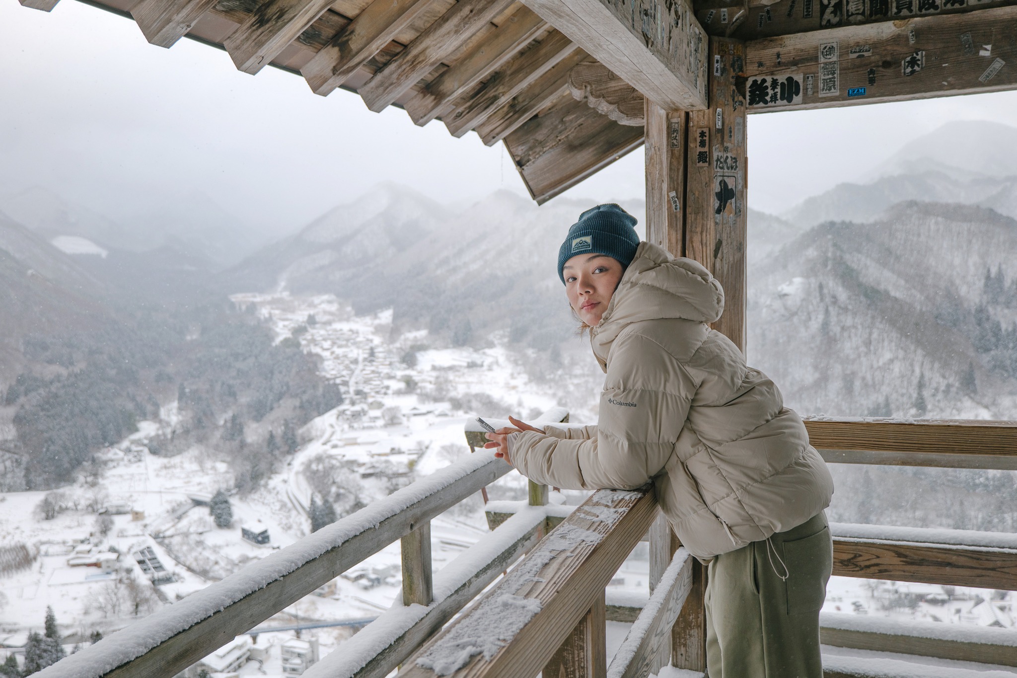 และไม่ต้องกลัวว่าจะเหนื่อยจนหอบแบบหมดสนุก เพราะตลอดเส้นทาง เขามีจุดพักให้เราได้หายใจหายคอ พร้อมความงดงามของโบราณสถานเก่าแก่ให้เราหยุดดู อาทิ ประตูไม้ อาคาร ศาลเจ้า หินขนาดมหึมามากมาย โดยรวมแล้วเราใช้เวลาไปเกือบชั่วโมง จนมาถึงจุดไคลแมกซ์ ‘Godaido Hall’ บริเวณริมผาที่มีหินก้อนใหญ่ พร้อมศาลาสีแดงฉานตั้งอยู่อย่างโดดเด่น ซึ่งถือเป็นจุดชมวิวที่สวยที่สุดของวัดนี้ เป็นวิวพาโนราม่าเห็นหุบเขาขาวสะอาด สลับทับซ้อนไปไกลสุดตา พร้อมหมู่บ้านเล็ก ๆ ที่อยู่ตรงกลาง ยามฤดูหนาวเราจะเห็นไอร้อนจากบ้าน การเคลื่อนตัวของรถยนต์ได้อย่างชัดเจน มองไปมองมาแล้วเหมือนเมืองตุ๊กตาในฝันเลย