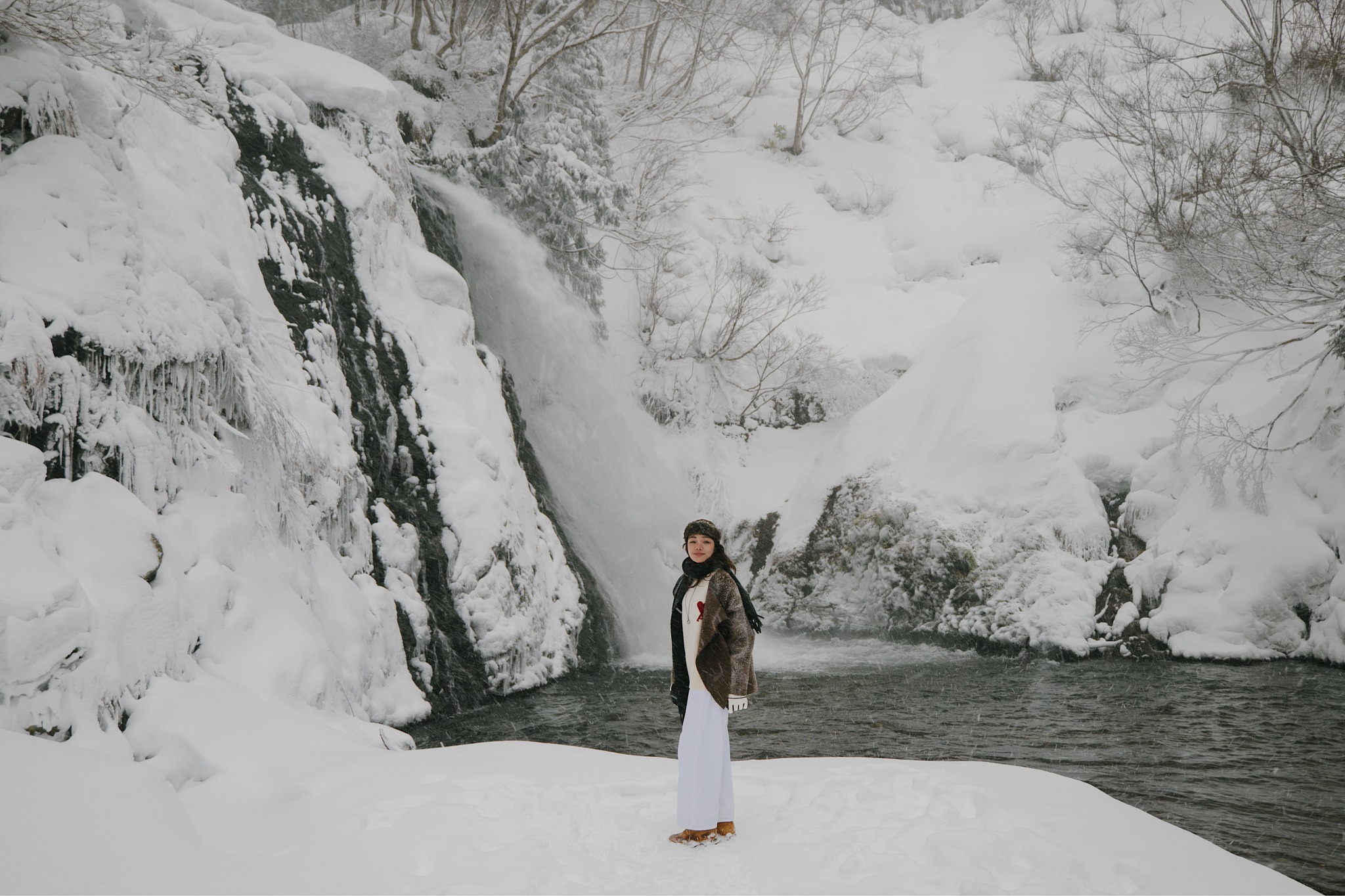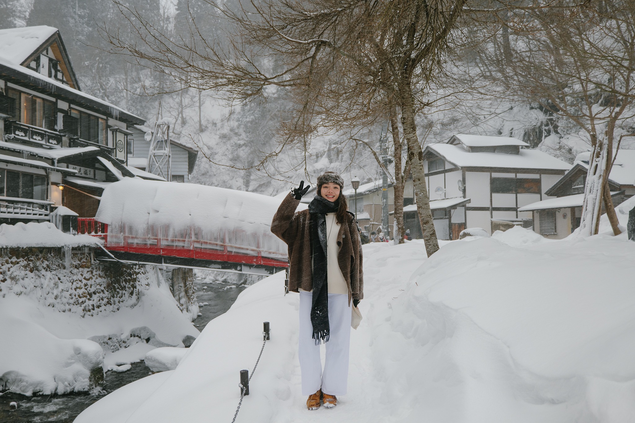 หากเดินลัดเลาะชิล ๆ ตามเส้นทางหลักริมแม่น้ำ Ginzan ที่พาดผ่านกลางหมู่บ้านไปเรื่อย ๆ จะเจอกับอีกหนึ่งมุมสงบที่หลายคนอาจเผลอเดินผ่าน นั่นคือ Shirogane Falls น้ำตกขนาดเล็กสูงราว 22 เมตร ที่เป็นเหมือนปลายทางของการเดินเล่นในหมู่บ้าน แม้จะไม่ใช่น้ำตกขนาดใหญ่ แต่พอมาอยู่ท่ามกลางฤดูหนาวที่หิมะปกคลุมทั้งโขดหิน ต้นไม้ และสะพานไม้รอบ ๆ กลับยิ่งดูสวยละมุนราวภาพวาดสีน้ำมัน เสียงน้ำที่ไหลไม่แรงจนเกินไปช่วยเติมบรรยากาศให้เงียบสงบและผ่อนคลาย ยิ่งช่วงเย็นถึงค่ำที่มีการเปิดไฟส่องบริเวณน้ำตก แสงไฟอุ่น ๆ จะสะท้อนกับหิมะและละอองน้ำ กลายเป็นอีกมุมโรแมนติกที่ควรค่าแก่การหยุดยืนดูนาน ๆ เราใช้เวลาตรงนี้ไปกับการถ่ายรูป เดินวนช้า ๆ สูดอากาศเย็น และปล่อยให้ความเงียบของธรรมชาติค่อย ๆ ซึมเข้ามา