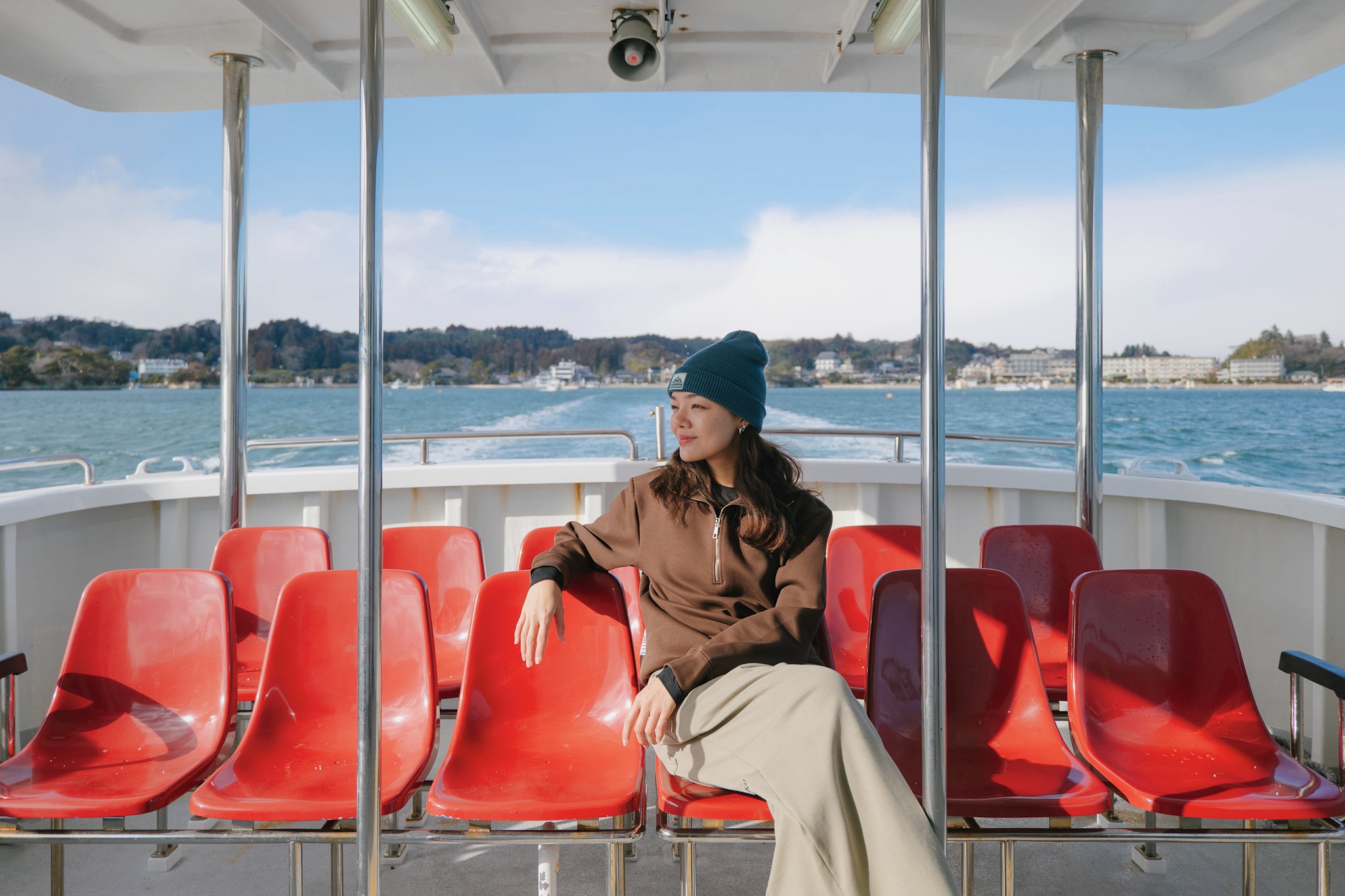 และกิจกรรมที่เรารอคอยก็มาถึง เอาไว้ทิ้งท้ายวันแบบสวย ๆ ด้วยการล่องเรือชมพระอาทิตย์ตกดินของเกาะมัตสึชิมะ ซึ่งเราเลือกขึ้นเรือรอบสุดท้ายคือประมาณบ่ายสามโมง เส้นทางการล่อง มีสองแบบคือ ขึ้นเรือจากอ่าวมัตสึชิมะวนรอบอ่าวดูเกาะต่าง ๆ และขึ้นเรือที่เกาะมัตซึชิมะ ล่องตามโค้งของอ่าวไปจอดแวะเที่ยวเมืองท่าที่ท่าเรือ Hon-Shiogama ซึ่งเราเลือกอย่างแรกใช้เวลาล่องประมาณ 50 นาที ราคา 1,500 เยน คงเพราะเริ่มใกล้ฤดูหนาวแล้ว ทำให้พระอาทิตย์ตกไวกว่าปกติ เราเลยเจอแสงสีทองสะท้อนลงเกาะต่าง ๆ อย่างสวยงามดั่งที่เห็นนี่แหละ บนเรือมีทั้งโซน out-door และ in-door ถ้าใครขี้หนาว ข้างในเขามีฮีตเตอร์อุ่น ๆ ให้ และจัดที่นั่งหลาย ๆ แบบให้เราเลือกตามชอบ สะอาดสะอ้าน ห้องน้ำครบ เรียกว่าเป็นเรือสำหรับนำเที่ยวจริง ๆ