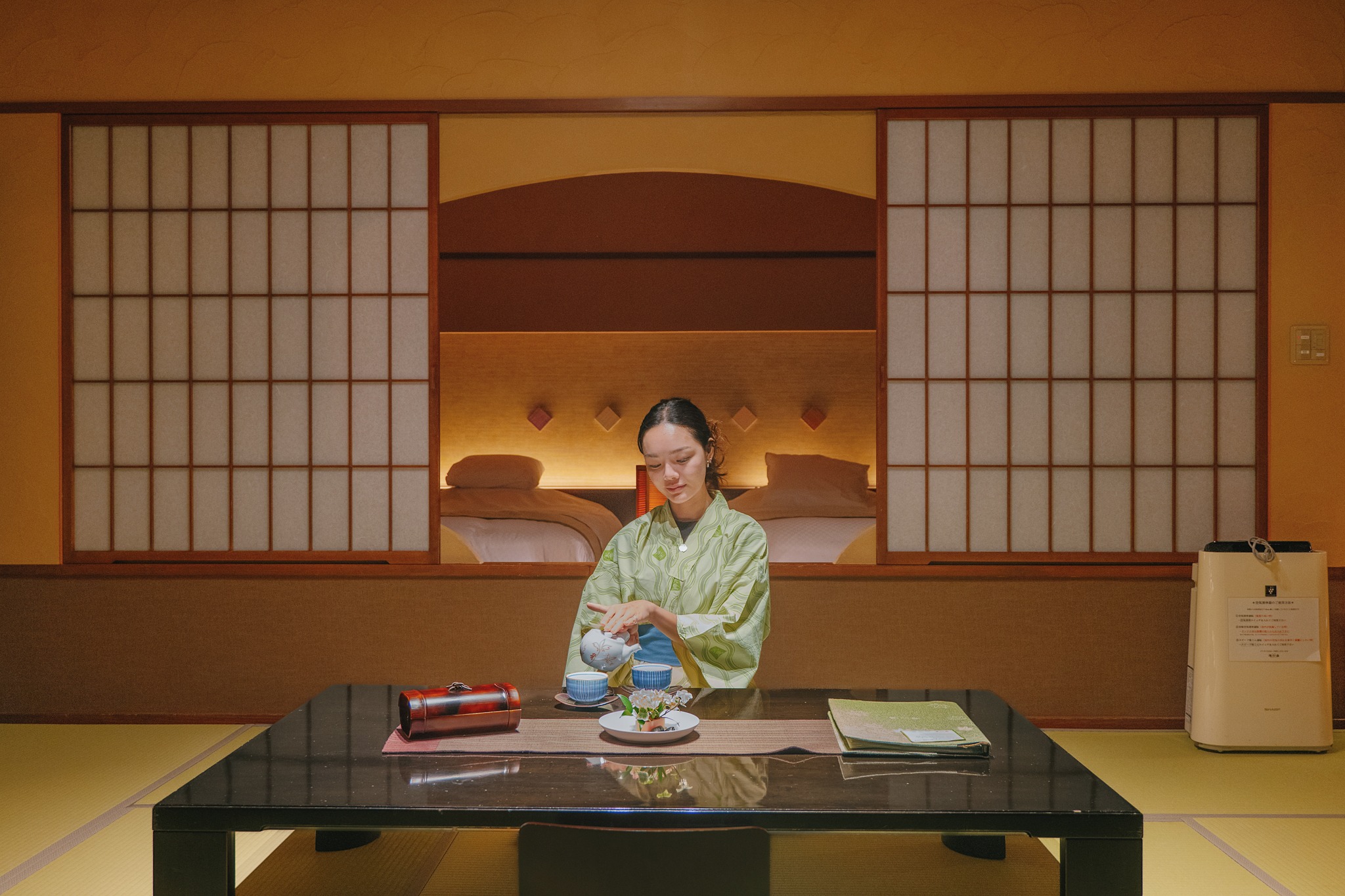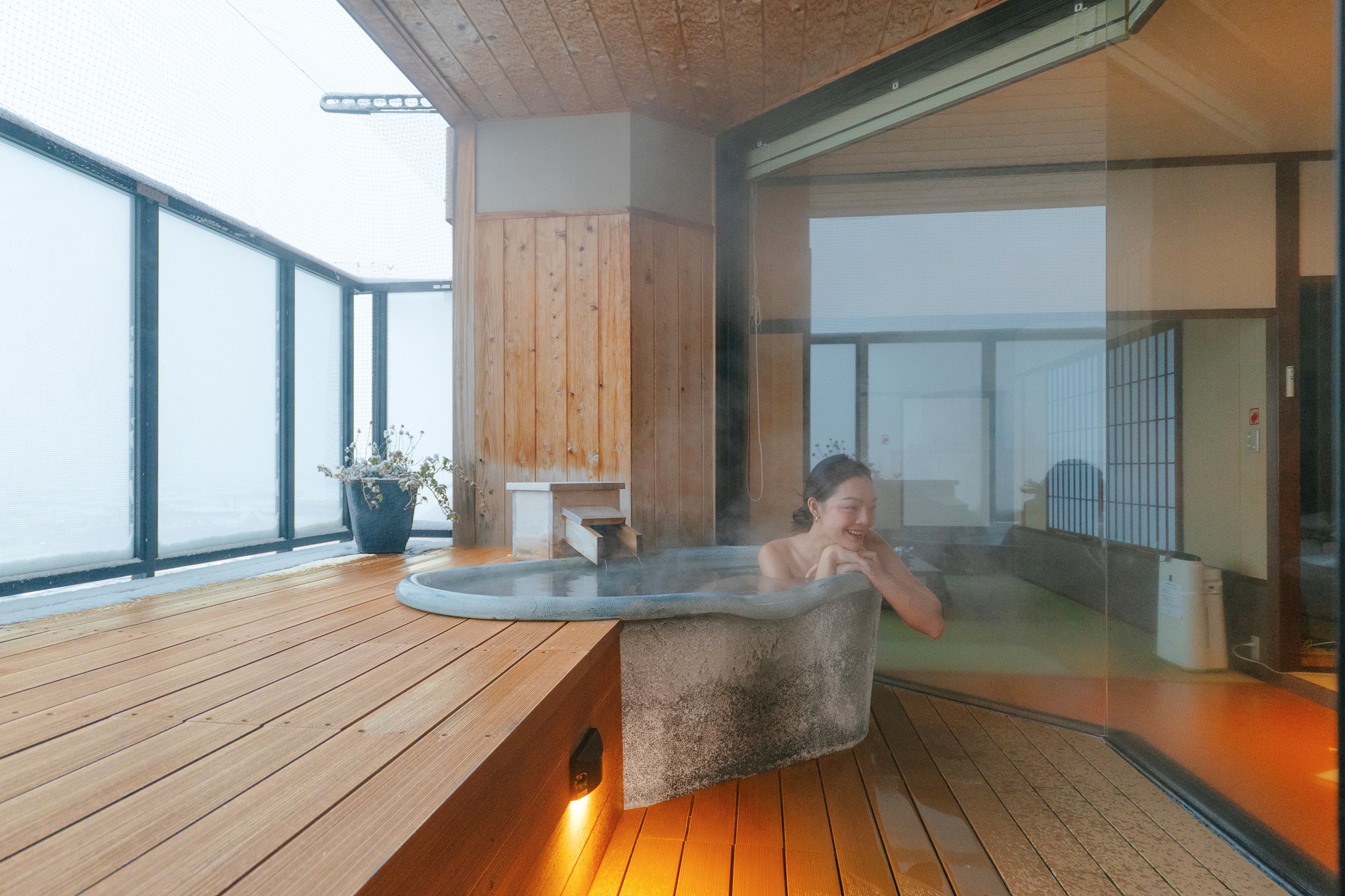 พอขึ้นมาที่ห้องพัก ฟีลจะเปลี่ยนเป็นความเป็นส่วนตัวมากขึ้น แต่ยังคงความสงบและใส่ใจในดีเทล ห้องพักสไตล์ญี่ปุ่นโมเดิร์น โปร่ง สะอาด ใช้โทนอบอุ่น และไฮไลต์ที่เราชอบมากคือในห้องมีออนเซ็นส่วนตัวแบบกึ่งเอาต์ดอร์ เปิดรับอากาศหนาวด้านนอก ยิ่งถ้ามาช่วงหิมะตกคือฟินแบบไม่ต้องอธิบาย แช่น้ำร้อนในบ่อหิน อุณหภูมิกำลังดี ตัดกับลมเย็นด้านนอก เป็นโมเมนต์ที่ทำให้เข้าใจจริง ๆ ว่าทำไมออนเซ็นถึงเป็นหัวใจของการพักผ่อนแบบญี่ปุ่น และที่ Tendo Onsen เองก็ขึ้นชื่อเรื่องน้ำแร่ที่ช่วยผ่อนคลายกล้ามเนื้อและทำให้ร่างกายเบาสบายอย่างรู้สึกได้