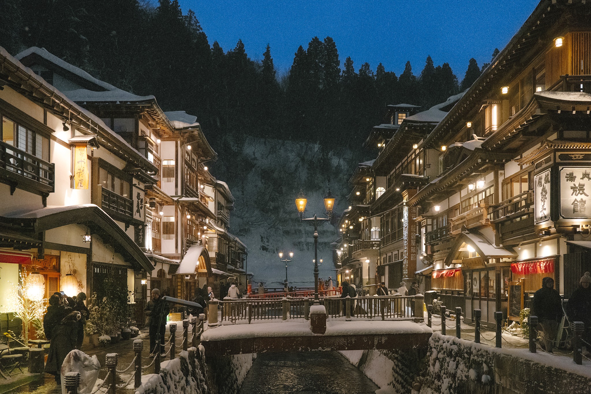 ช่วงค่ำของ Ginzan Onsen คือไฮไลต์ที่โรแมนติกจนต้องยกใจให้จริง ๆ พอแสงอาทิตย์ลับขอบฟ้า ทั้งหมู่บ้านจะค่อย ๆ เปิดไฟสีส้มอุ่นจากโคมไฟและตัวอาคารเรียวกังไม้เก่าแก่ที่เรียงรายสองฝั่งแม่น้ำ แสงไฟสะท้อนกับเกล็ดหิมะที่โปรยลงมาเบา ๆ ทำให้บรรยากาศเหมือนหลุดเข้าไปในฉากหนังย้อนยุคแบบญี่ปุ่นแท้ ๆ สำหรับเราแล้ว ที่นี่จะมาเดินเล่นแบบเดย์ทริปก็ฟิน หรือถ้าได้ค้างคืนในเรียวกังสักคืนยิ่งเต็มอิ่ม เพราะนอกจากจะได้แช่ออนเซ็นท่ามกลางอากาศหนาวแล้ว ยังได้ซึมซับความเงียบสงบยามค่ำคืนของหมู่บ้านอย่างเต็มที่​​
