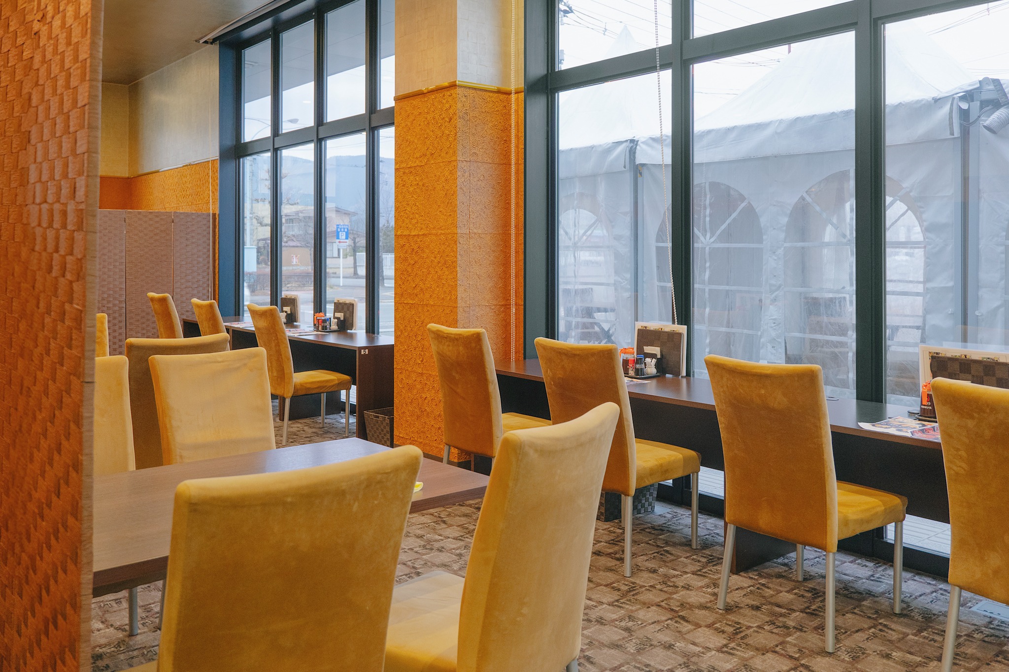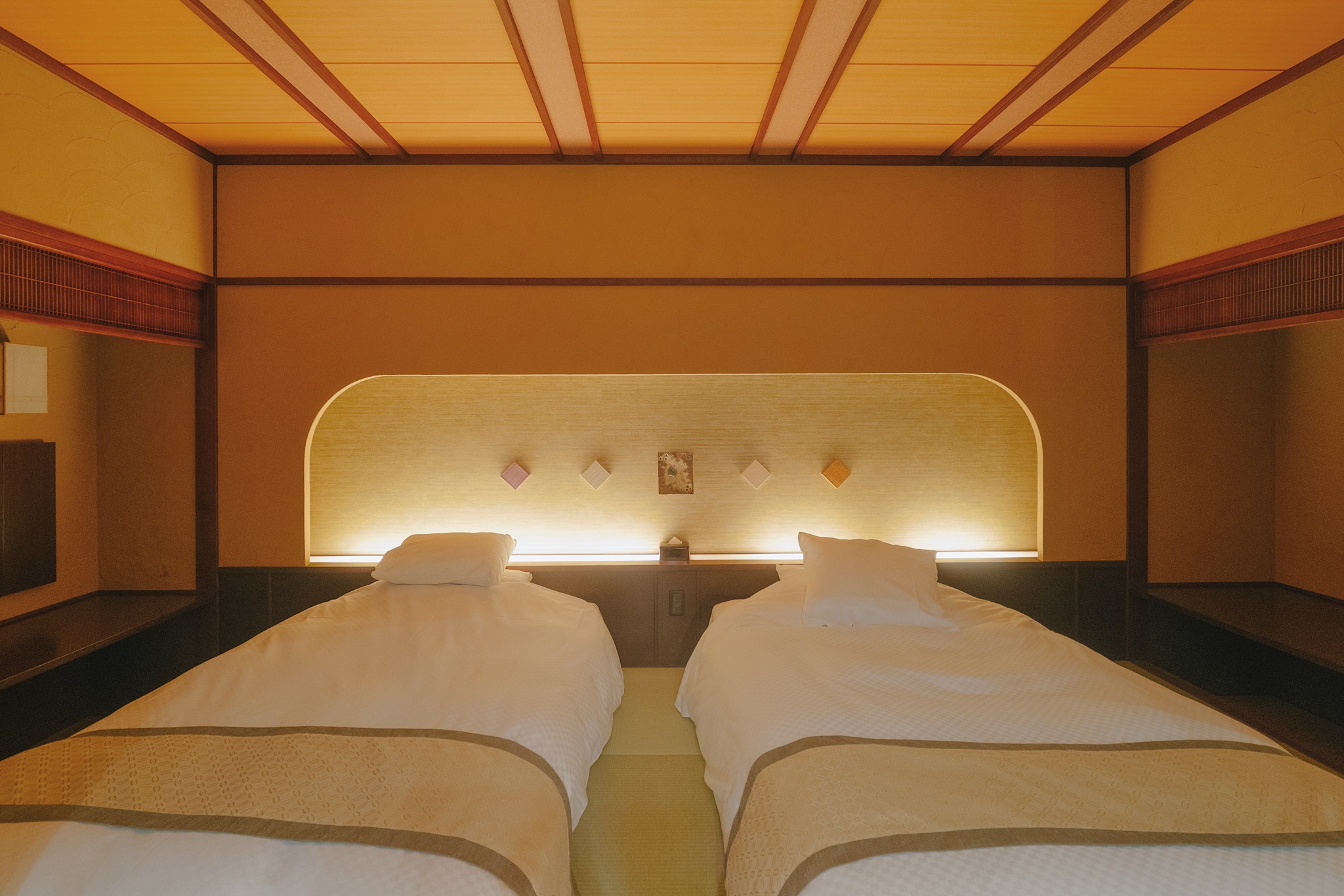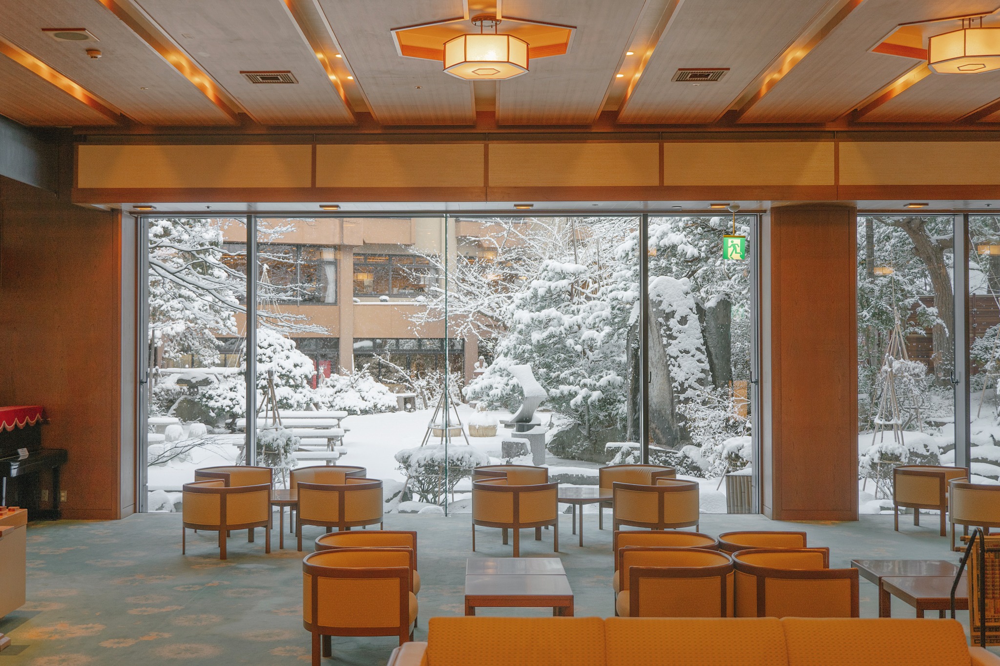 หลังจากตะลุยเที่ยวกันมาทั้งวัน การได้มาถึง Tendo Onsen Takinoyu Hotel คือโมเมนต์ที่รู้สึกได้ทันทีว่าร่างกายกำลังจะได้พักจริง ๆ แค่ก้าวเข้าเขตโรงแรม ภาพแรกที่ทำให้เราว้าวคือบรรยากาศเรียวกังแท้ ๆ ที่โอบล้อมด้วยความสงบ ตัวอาคารไม้ขนาดใหญ่ดูขรึมแต่แฝงความอบอุ่น และยิ่งในวันที่หิมะโปรยคลุมสวนและลานด้านหน้า ก็ยิ่งละมุนเหมือนฉากหนังญี่ปุ่นยุคเก่า โถงล็อบบี้โปร่งโล่ง รับแสงธรรมชาติ มีมุมให้นั่งพัก จิบชา มองวิวสวนหิมะได้เพลิน ๆ ซึ่งทั้งหมดนี้คือคอนเซปต์ของ Takinoyu ที่ตั้งใจให้แขก “ค่อย ๆ ช้าลง” ตั้งแต่วินาทีแรก ผ่านการจัดพื้นที่ วัสดุธรรมชาติ และความเรียบง่ายแบบญี่ปุ่นที่ไม่ต้องปรุงแต่ง แต่ดูดีไปหมด