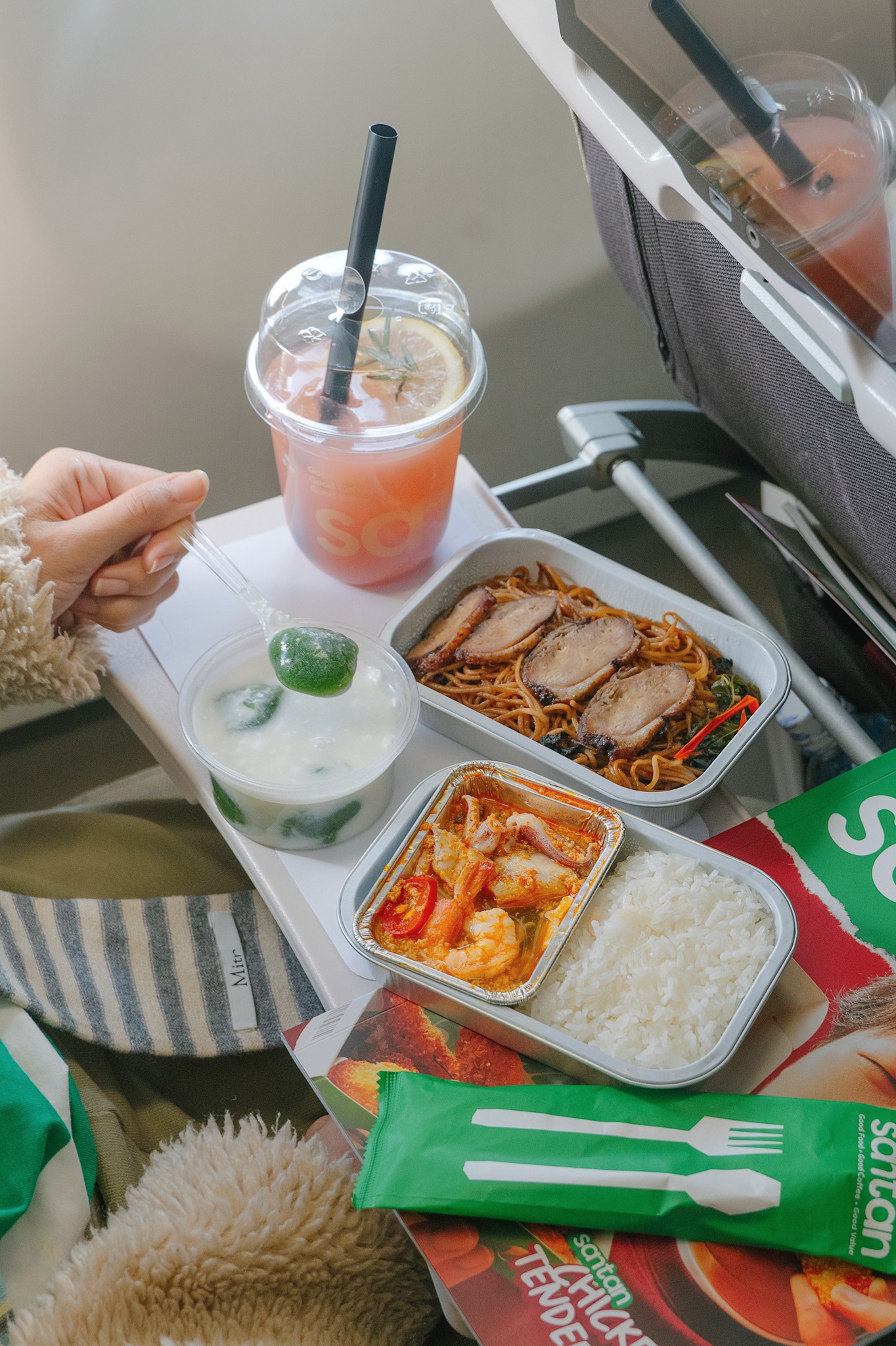 ในบรรดาสายการบินโลว์คอสต์ ความเลิศที่เราชอบมากที่สุดของ ไทยแอร์เอเชีย เอ็กซ์ คือเรื่องอาหารและเครื่องดื่ม เพราะถูกปากมาก แถมยังมีรายการให้เลือกเยอะและขยันออก seasonal menu อยู่ตลอด รอบนี้เราได้ลอง 2 เมนูคาวใหม่ล่าสุด เริ่มจากข้าวห่อหมกทะเลมะพร้าวอ่อนที่กลิ่นสมุนไพรหอมชัด เนื้อทะเลให้มาแน่น กินกับข้าวสวยร้อน ๆ คืออร่อยกำลังดี ตามด้วยบะหมี่เป็ดย่างกะเพรากรอบ เป็ดย่างหนังหอม เนื้อนุ่ม คลุกกะเพรารสจัดจ้านสไตล์ไทย ช่วยตัดเลี่ยนได้ลงตัวสุด ส่วนของหวานเราเติมหยกสดอินทนิลเนื้อเหนียวนุ่มหอมกะทิ ก่อนปิดท้ายด้วยน้ำมังคุดเลมอนเนดพีชเจลลี่รสเปรี้ยวหวานสดชื่น ดื่มแล้วเฟรชมาก สำหรับเส้นทางบินระยะไกลยังสามารถสั่งเพิ่มแบบ buy-on-board ระหว่างบินได้ตลอด ถือเป็นอีกหนึ่งเหตุผลที่ทำให้การบินกับ ไทยแอร์เอเชีย เอ็กซ์ ไม่น่าเบื่อและอร่อยกว่าที่คิดทุกครั้ง