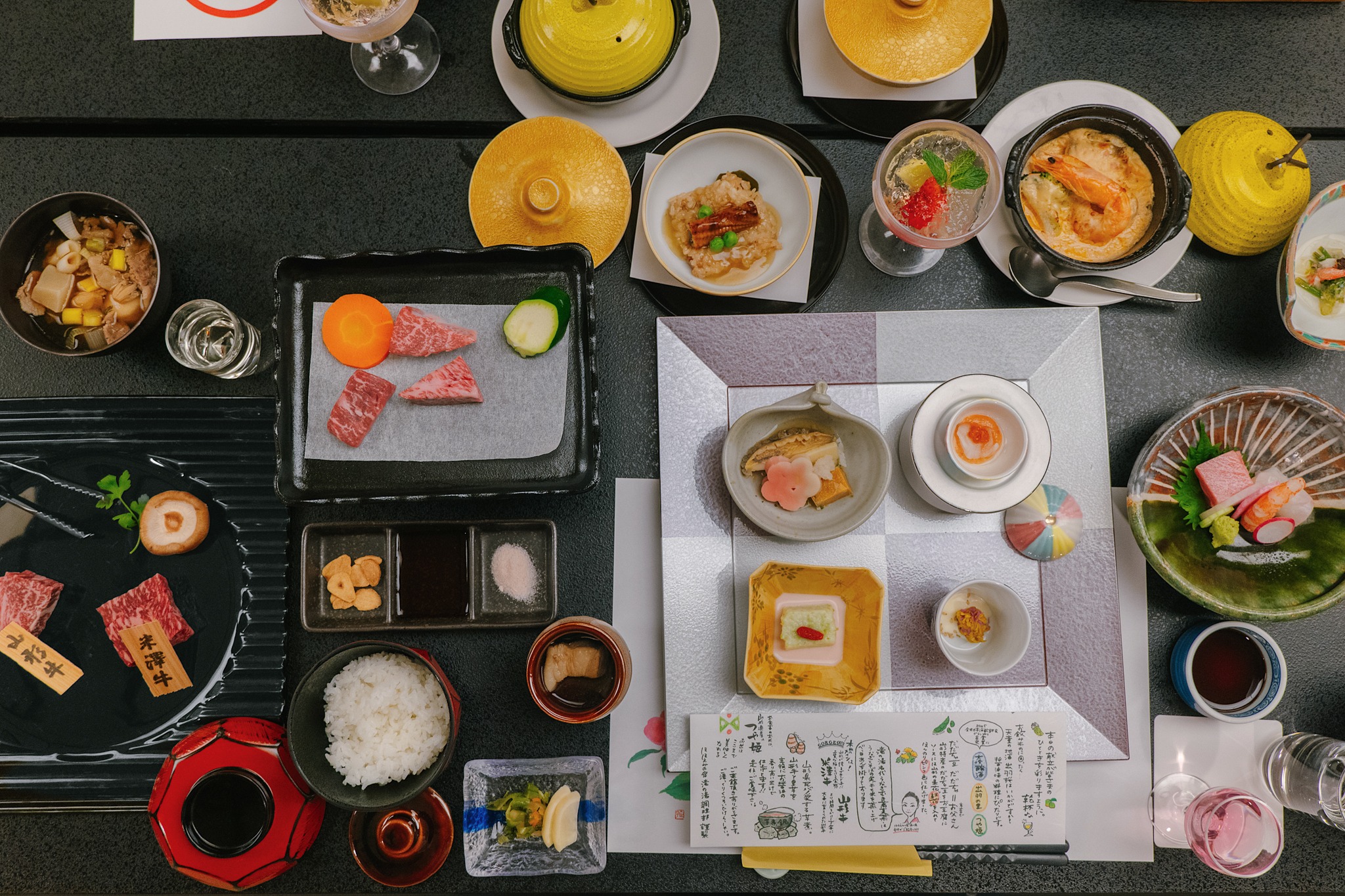 ช่วงค่ำของเราถูกยกให้เป็นไฮไลต์ด้วยมื้อไคเซกิที่ตั้งใจชูวัตถุดิบระดับภูมิภาค โดยเฉพาะเมน Yamagata & Yonezawa Beef Tasting ที่เสิร์ฟเนื้อวัวชื่อดังของจังหวัดถึงสองสายพันธุ์ในมื้อเดียว เนื้อยามากาตะให้สัมผัสนุ่มฉ่ำ ไขมันแทรกกำลังดี ส่วนเนื้อโยเนะซาวะเด่นเรื่องความหวานและเนื้อสัมผัสที่ละลายในปาก เสิร์ฟคู่ซอสโชยุกระเทียม เกลือหิน และกระเทียมทอดกรอบ ช่วยดึงรสชาติของเนื้อออกมาได้อย่างชัดเจน นอกจากนี้ทั้งคอร์สยังแทรกวัตถุดิบท้องถิ่นอย่างโซบะบัควีต มิโสะสาเกะลีส์ อาหารทะเลสด และข้าวสายพันธุ์ Tsuyahime ของยามากาตะ ทำให้มื้อนี้ไม่ใช่แค่อิ่ม แต่เป็นการ “ชิมตัวตนของจังหวัด” ผ่านอาหารอย่างแท้จริง และจบวันได้อย่างอิ่มฟินพอดี ก่อนจะกลับไปพักผ่อน ทิ้งตัวลงนอนพร้อมความรู้สึกว่า วันนี้คืออีกหนึ่งวันที่ดีมากของทริปนี้จริง ๆ