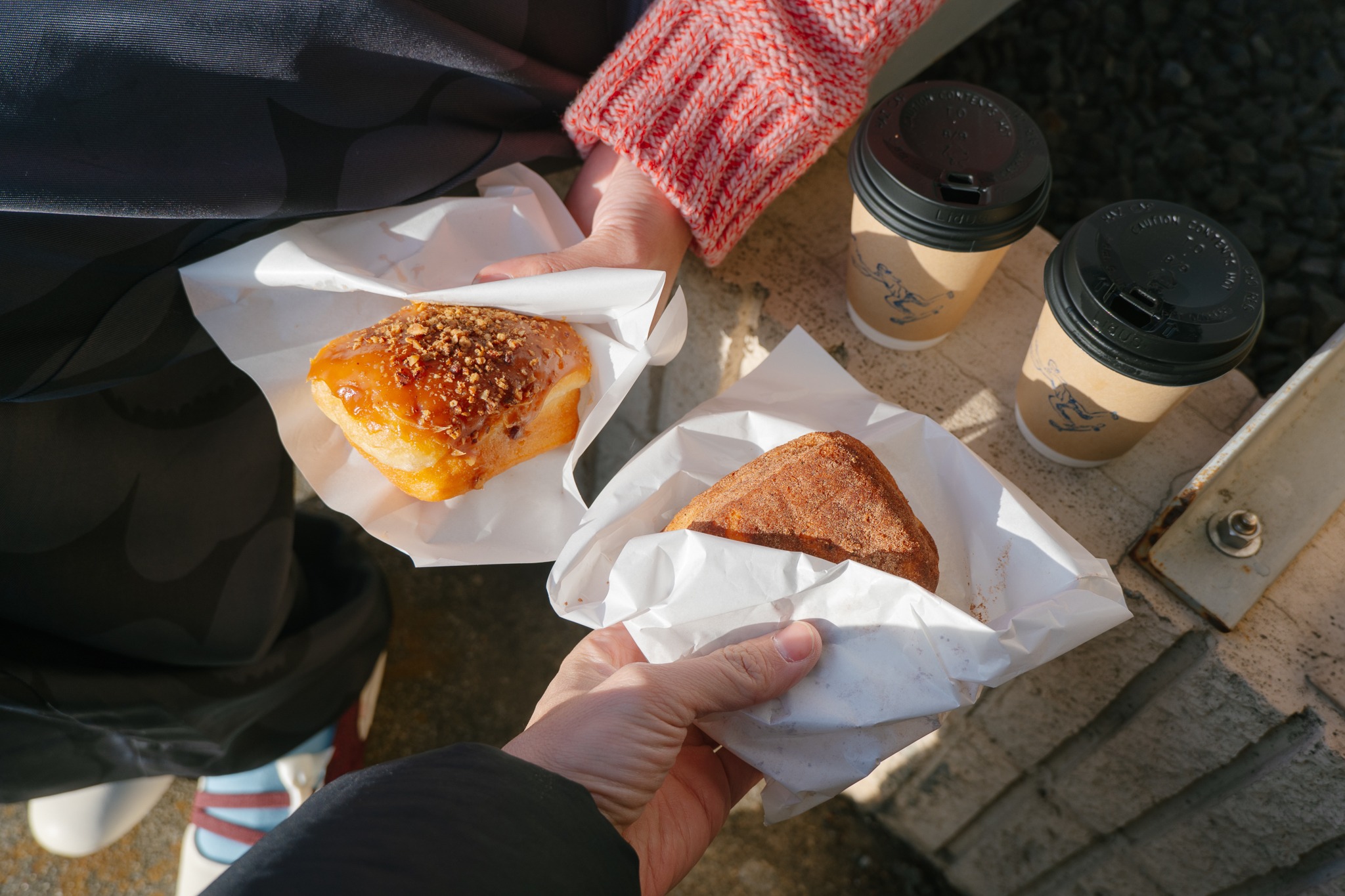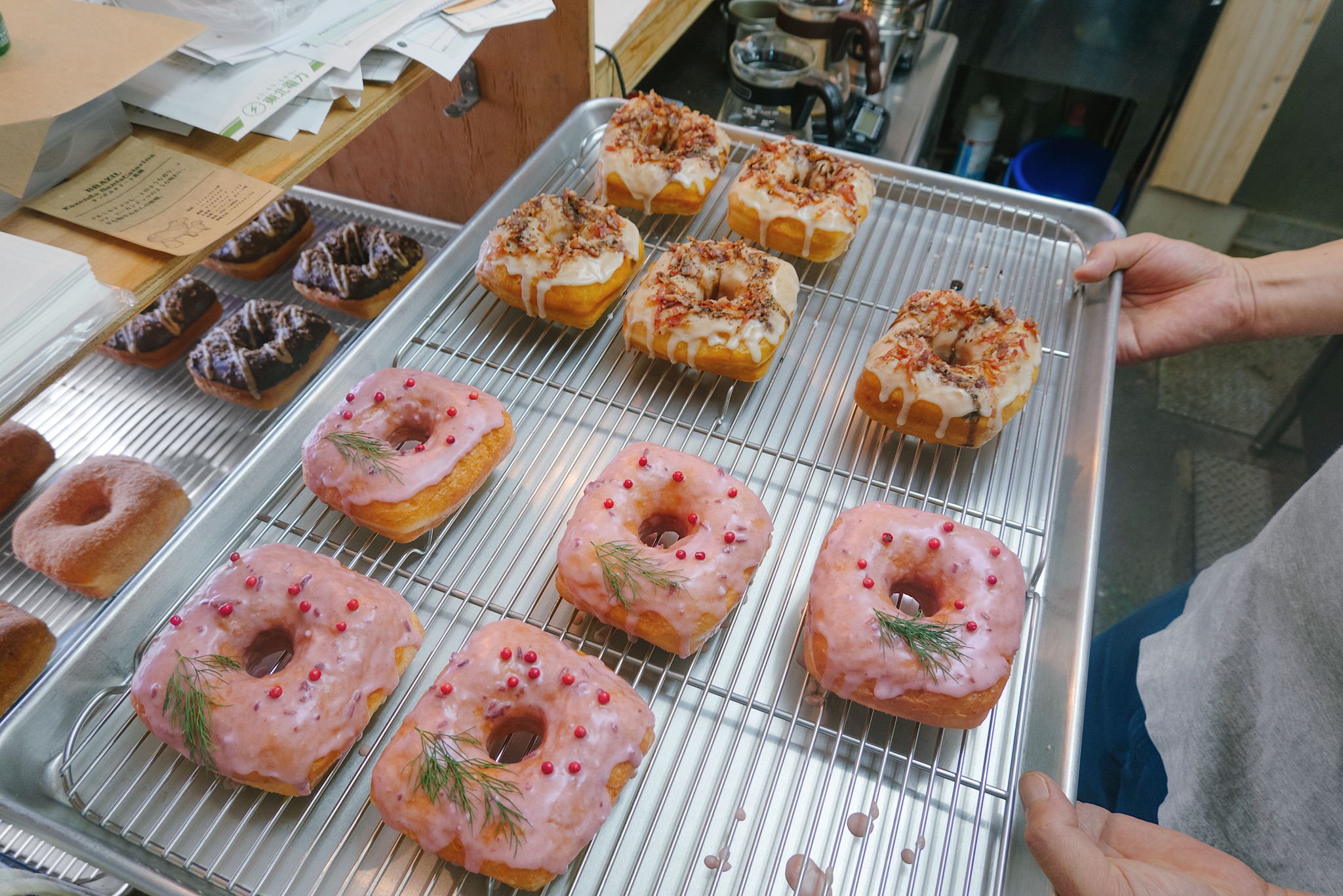ร้านนี้ขอยกให้เป็นอีกหนึ่งร้านในดวงใจเลยแหละ ด้วยความเป็นเอกลักษณ์ของเมนูและคนขายที่ยิ้มแย้ม คอยเปิด Playlist เพลงสุด Unique ที่ออกจะหลากหลายทั้งฮิปฮอป อินดี้ เรโทร ทำให้เราแอบเพลินไปด้วย แม้จะเป็นร้านเล็ก ๆ ที่แทบไม่มีที่นั่ง แต่เมนูที่มีนั้นอัดแน่นไปด้วยคุณภาพ ตัวเด่นประจำร้านเลยคือโดนัทรูปทรงสี่เหลี่ยมจตุรัส ที่มีรูตรงกลางแบบงง ๆ แถมหน้าโดนัทก็มีให้เลือกเยอะมาก ทั้งคาวและหวาน หรือจะรวมคาวกับหวานไว้ด้วยกันเหมือนที่เราสั่งนี้ก็ได้ “โดนัทเคลือบน้ำตาลโรยเบคอน” โดนัทนุ่ม ๆ หวาน ๆ อ่อนไม่บาดคอ ที่มีเบคอนเค็ม ๆ กรุบกรอบโรยอยู่ด้านบน ความจริงรสชาติก็ไม่เลวเหมือนกัน นอกจากฉีกกฎโดนัทกลมในหัวเราไปจนหมดสิ้นแล้ว ยังฉีกเรื่องโดนัทเป็นของหวานไปได้ด้วย คะแนนความครีเอทเราให้เต็ม 10 ไปเลยจ้า