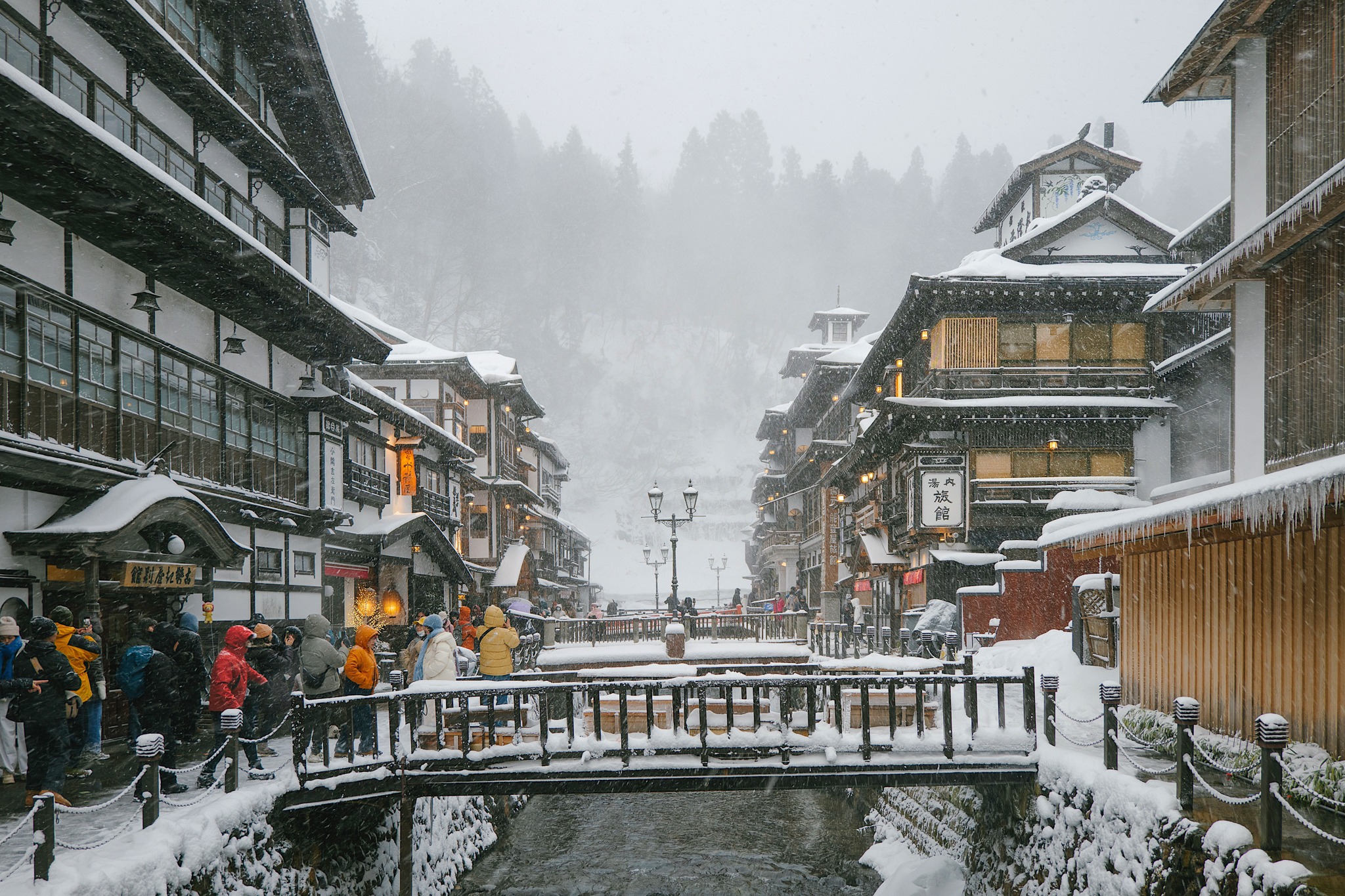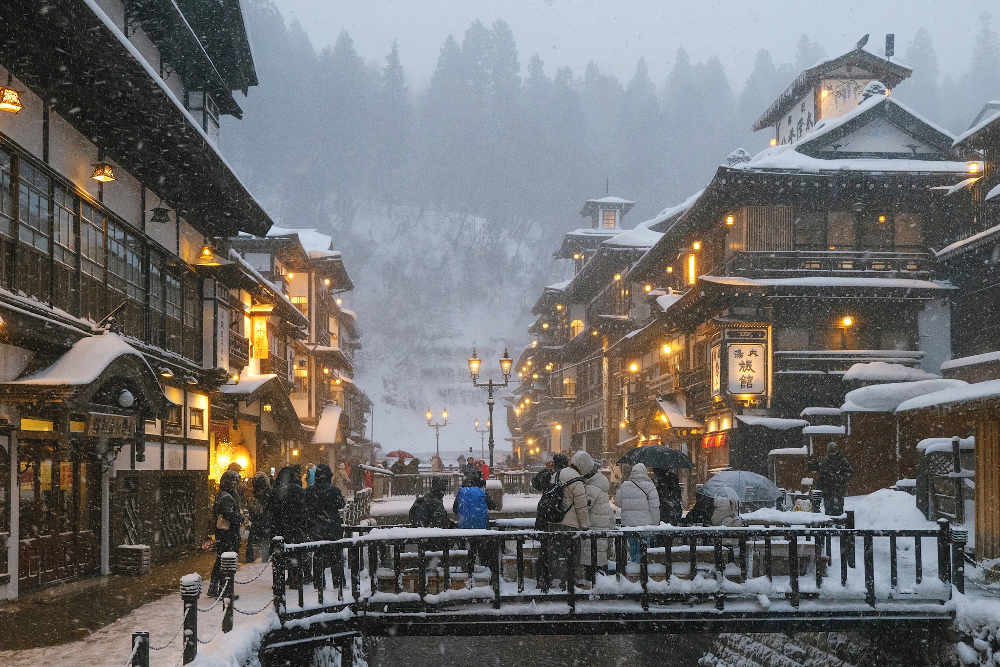 ว่าด้วยเรื่องรูปลักษณ์ของเมือง Ginzan Onsen ได้รับการขนานนามว่าเป็นหมู่บ้านออนเซ็นที่โรแมนติกที่สุดแห่งหนึ่งในญี่ปุ่น อาคารไม้สไตล์เรียวกังที่เรียงรายสองฝั่งแม่น้ำ Ginzan สร้างขึ้นในยุคไทโช บางหลังสูงถึง 3–4 ชั้น และหลายแห่งได้รับการขึ้นทะเบียนเป็นมรดกทางวัฒนธรรม บรรยากาศของถนนหินปูและโคมไฟแก๊สที่ส่องแสงอุ่น ๆ ยิ่งขับให้เมืองดูเหมือนฉากละครย้อนยุค โดยเฉพาะยามค่ำคืนท่ามกลางหิมะโปรยปราย ที่นี่จึงสวยเกินบรรยายจนเหมือนภาพวาด แม้จะคึกคักไปด้วยผู้คน แต่กลับอบอวลด้วยความสงบอันน่าหลงใหล หากแพลนมาพักแนะนำให้จองล่วงหน้านาน ๆ เพราะหน้าหนาวคือ ไฮซีซัน โรงแรมหลายแห่งเต็มแบบข้ามปีกันเลยทีเดียว